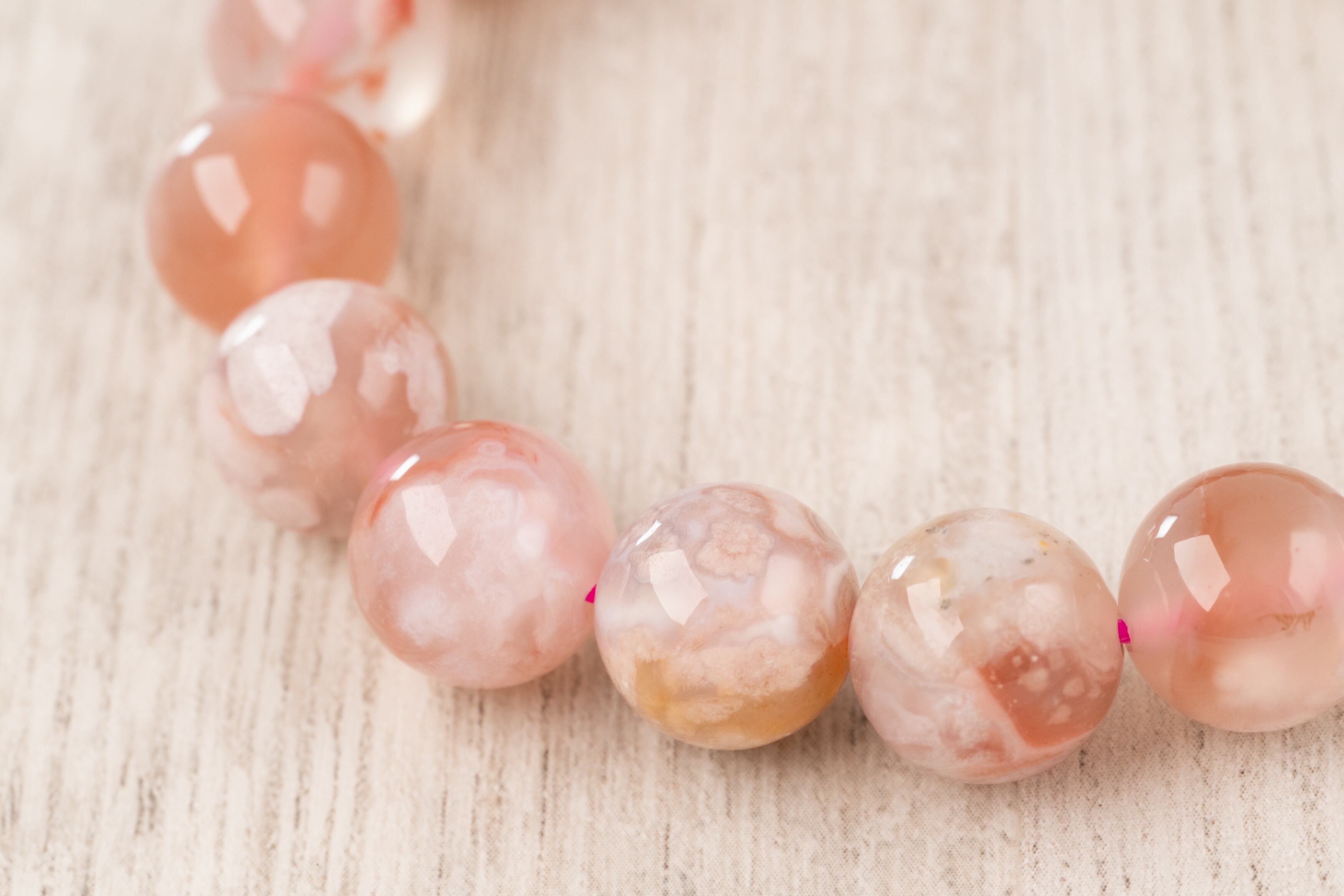 瑪瑙が持つ基本的な効果に加え、桜瑪瑙特有の優しいエネルギーと華やかさが持ち主の心を明るくし、前向きな気持ちを育むと言われています。