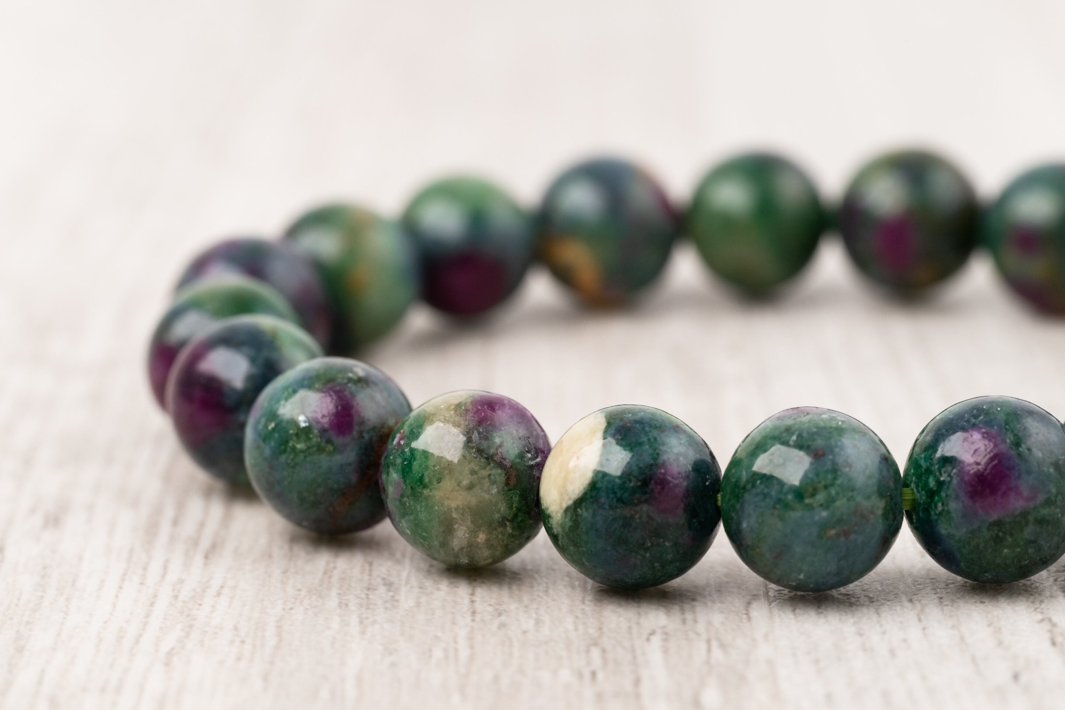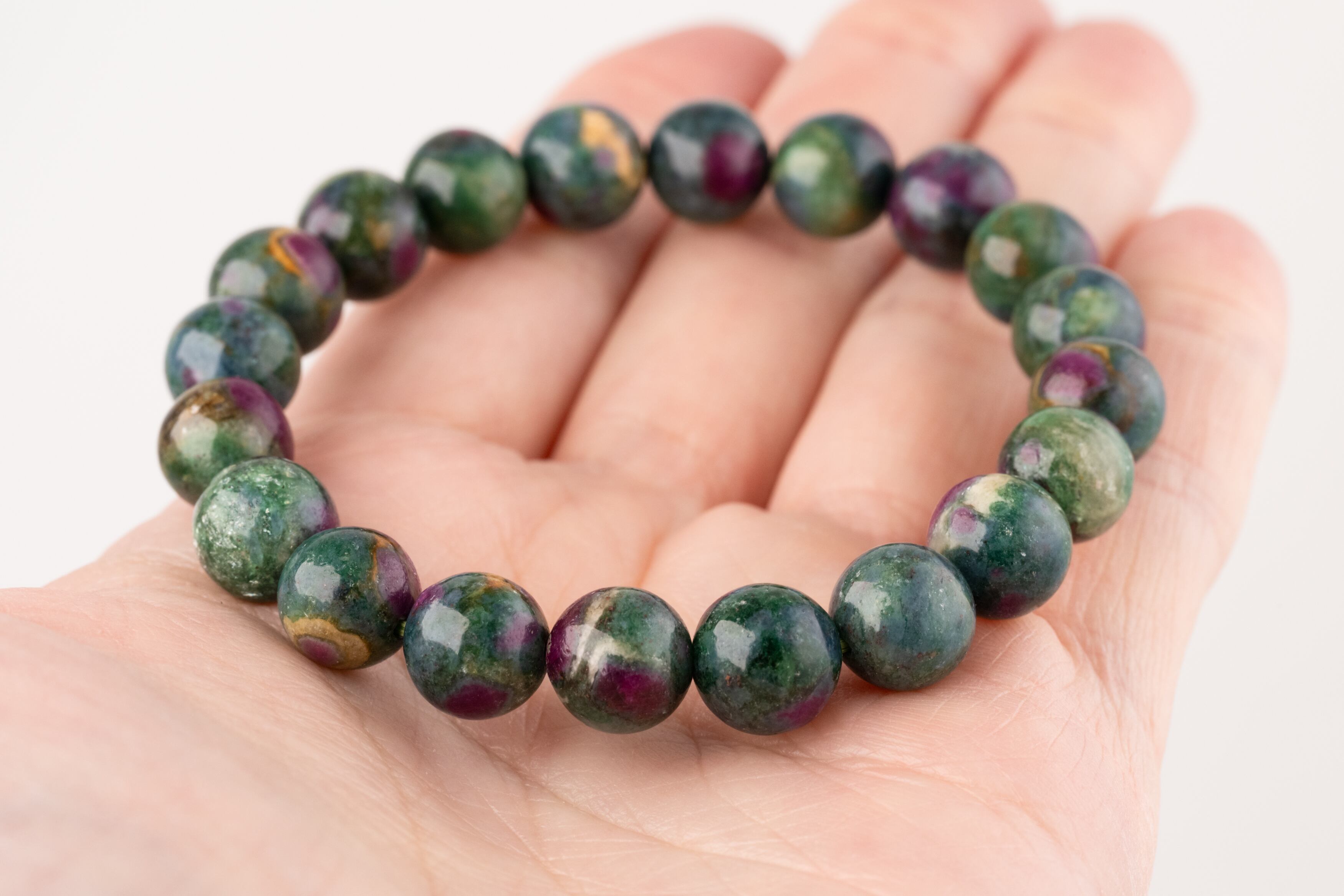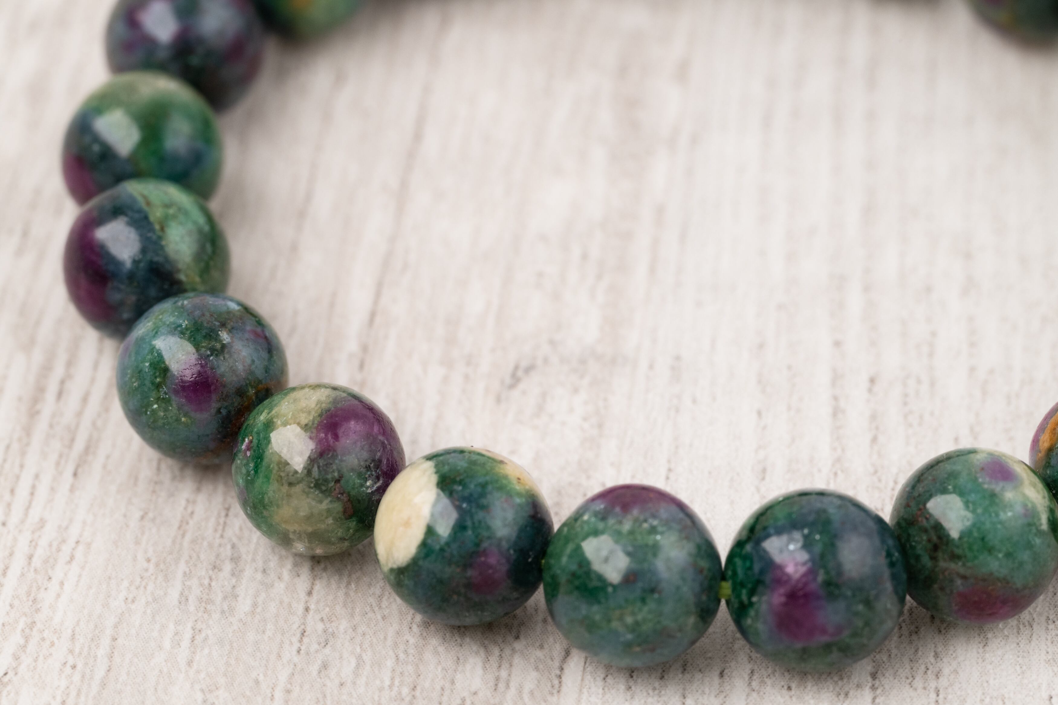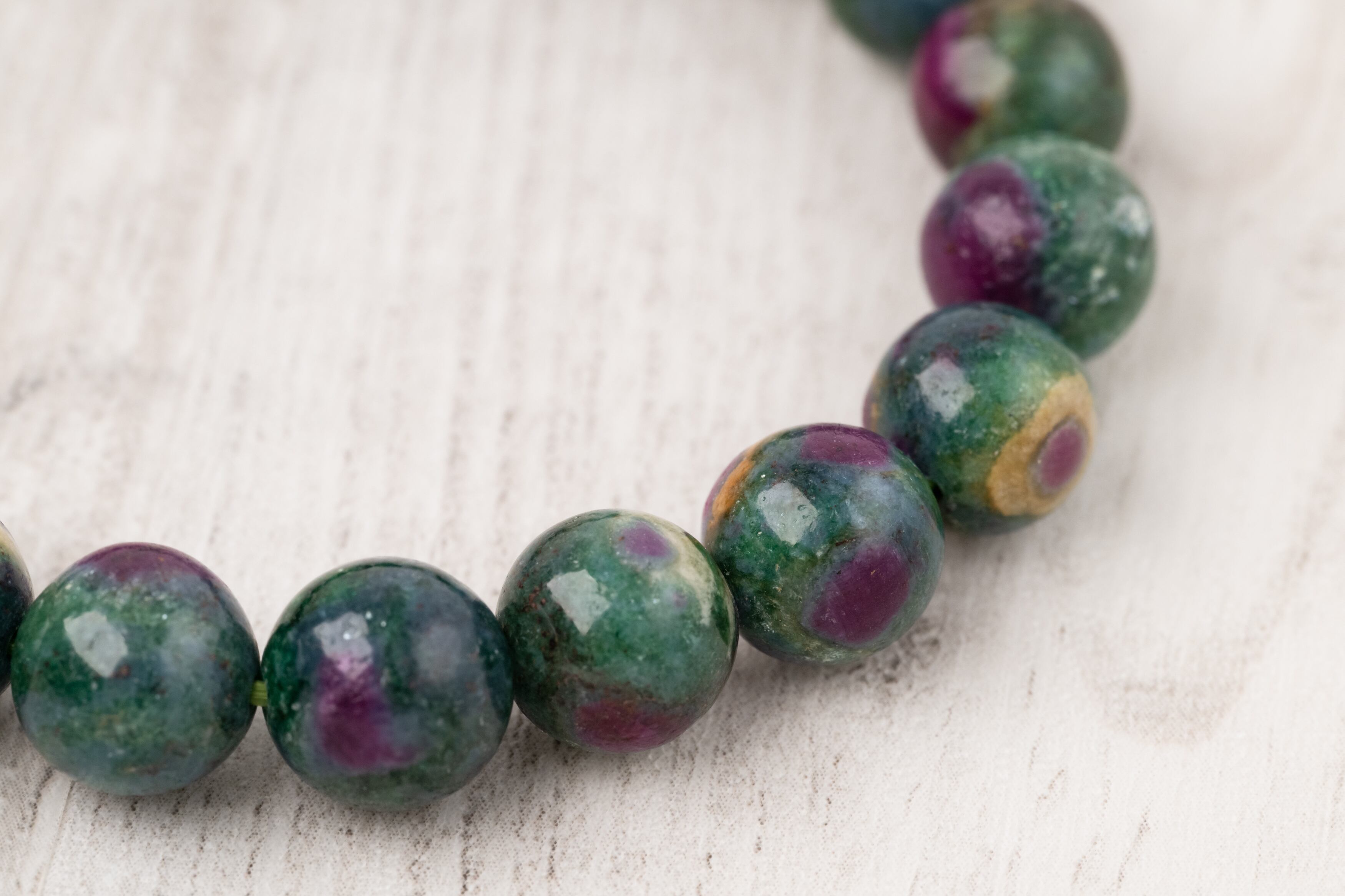 ルビーインフックサイトは緑色のフックサイト(クロム雲母)の中に鮮やかなピンク~赤色のルビーが混ざり合った非常にエネルギッシュな天然石です。