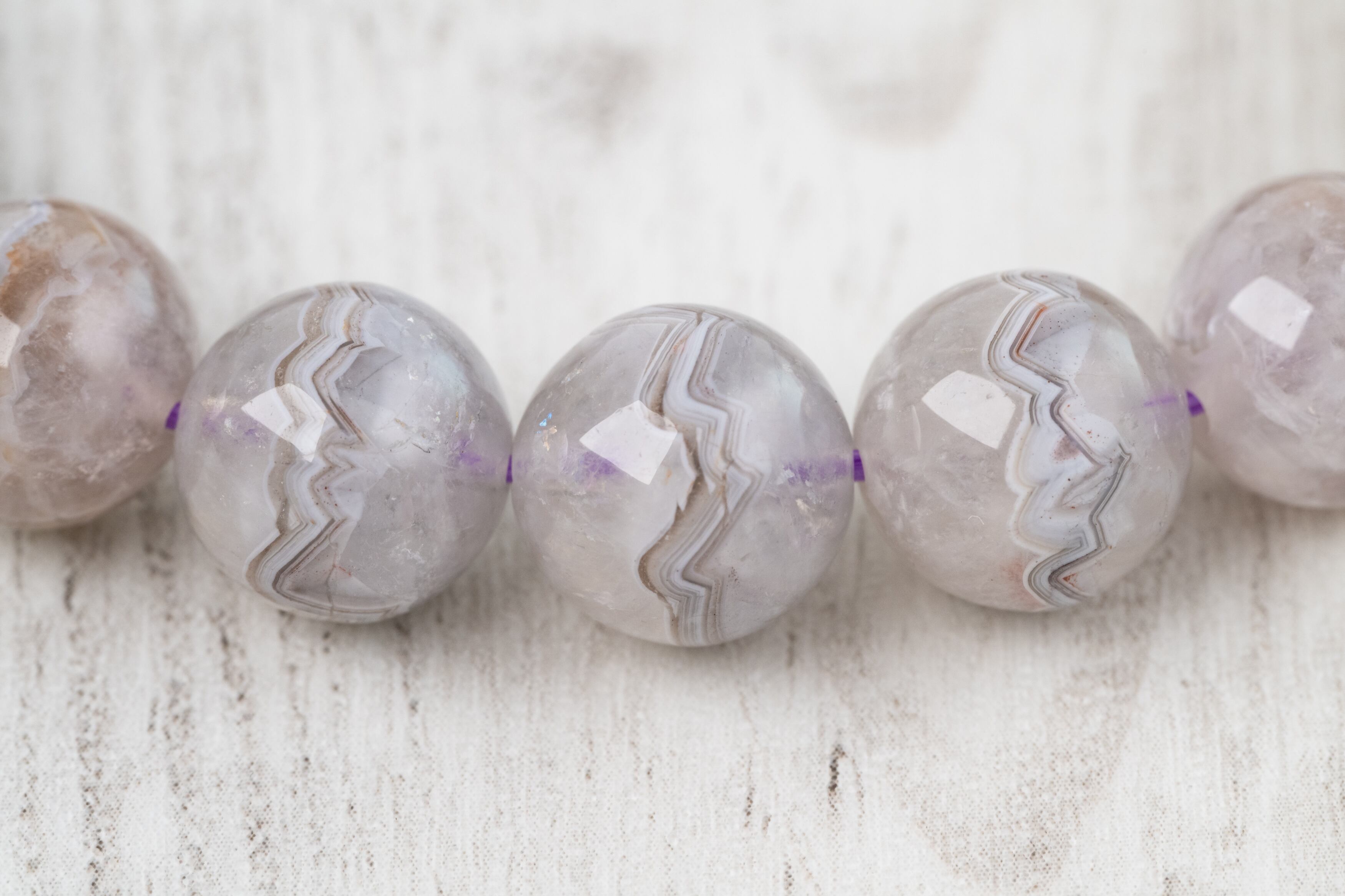 通常のクレイジーレースアゲートの持つ複雑で躍動感のある模様に加え、アメジストの成分が混ざり込むことで、淡く美しい紫色を帯びているのが特徴です。