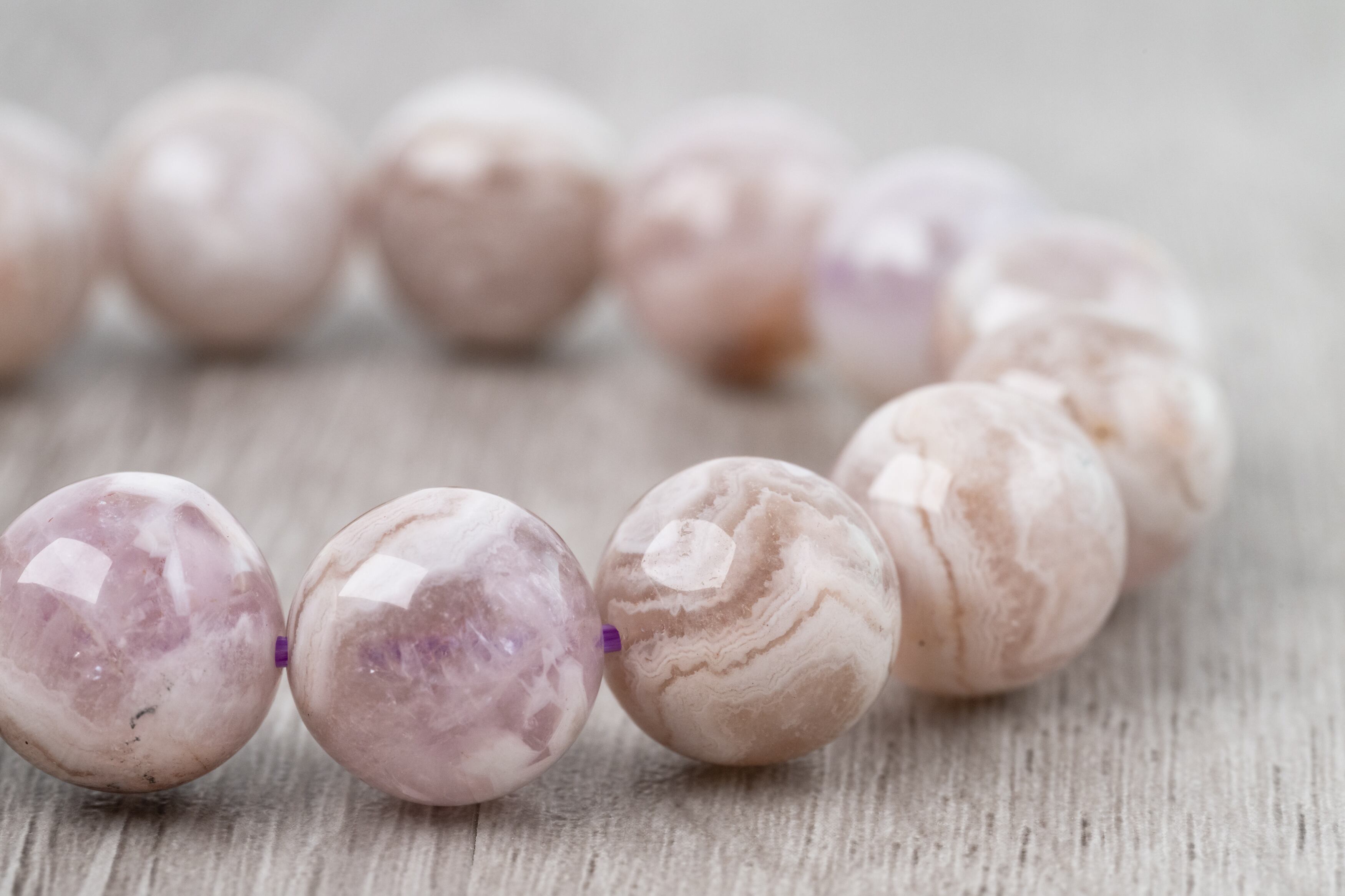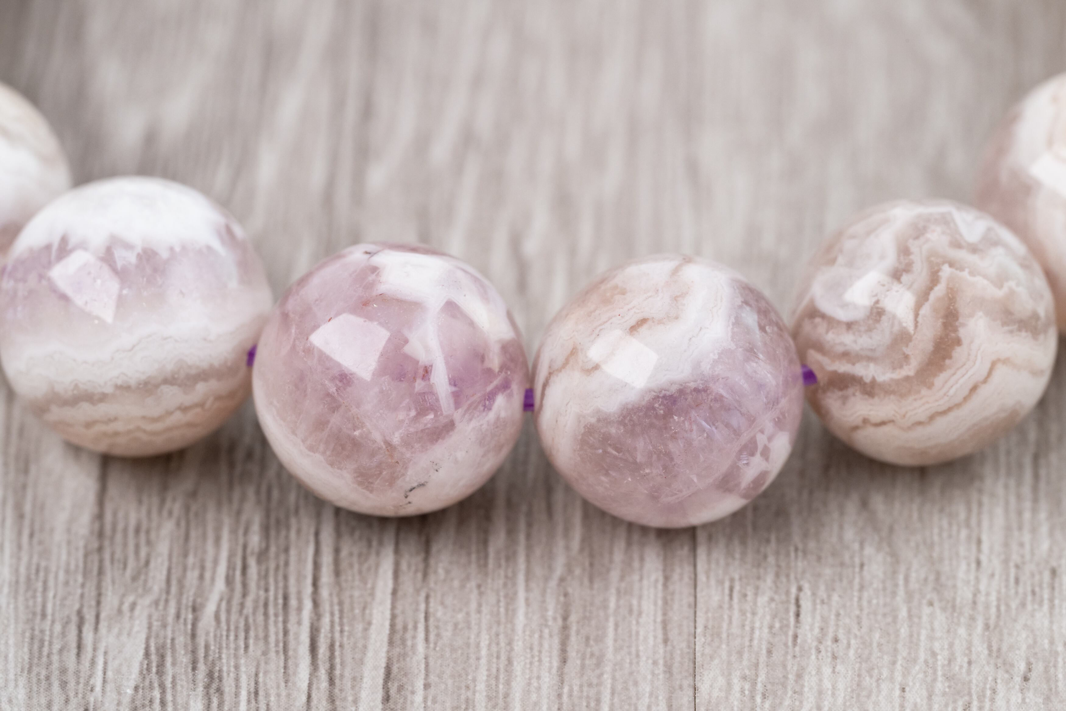 通常のクレイジーレースアゲートの持つ複雑で躍動感のある模様に加え、アメジストの成分が混ざり込むことで、淡く美しい紫色を帯びているのが特徴です。