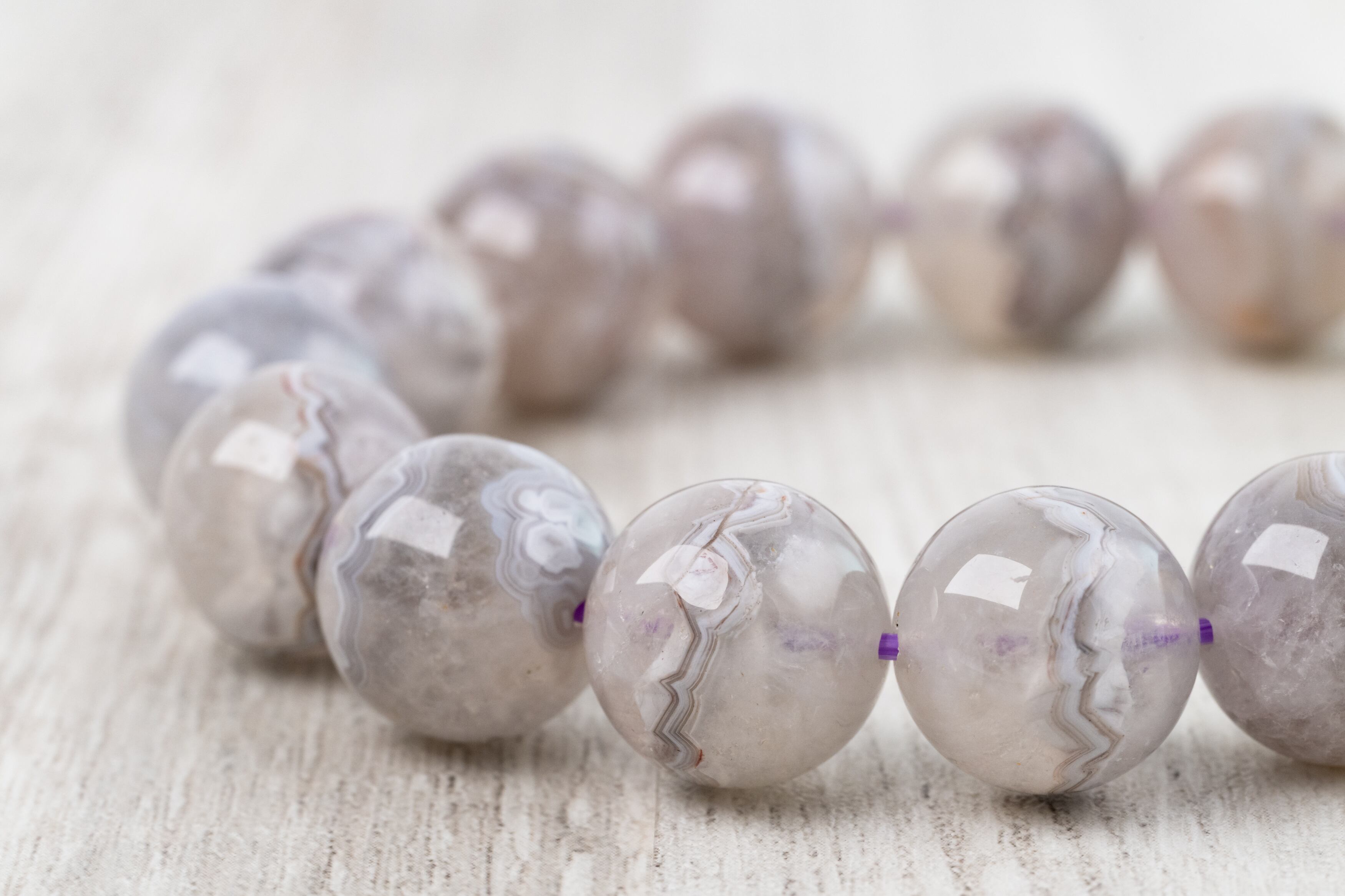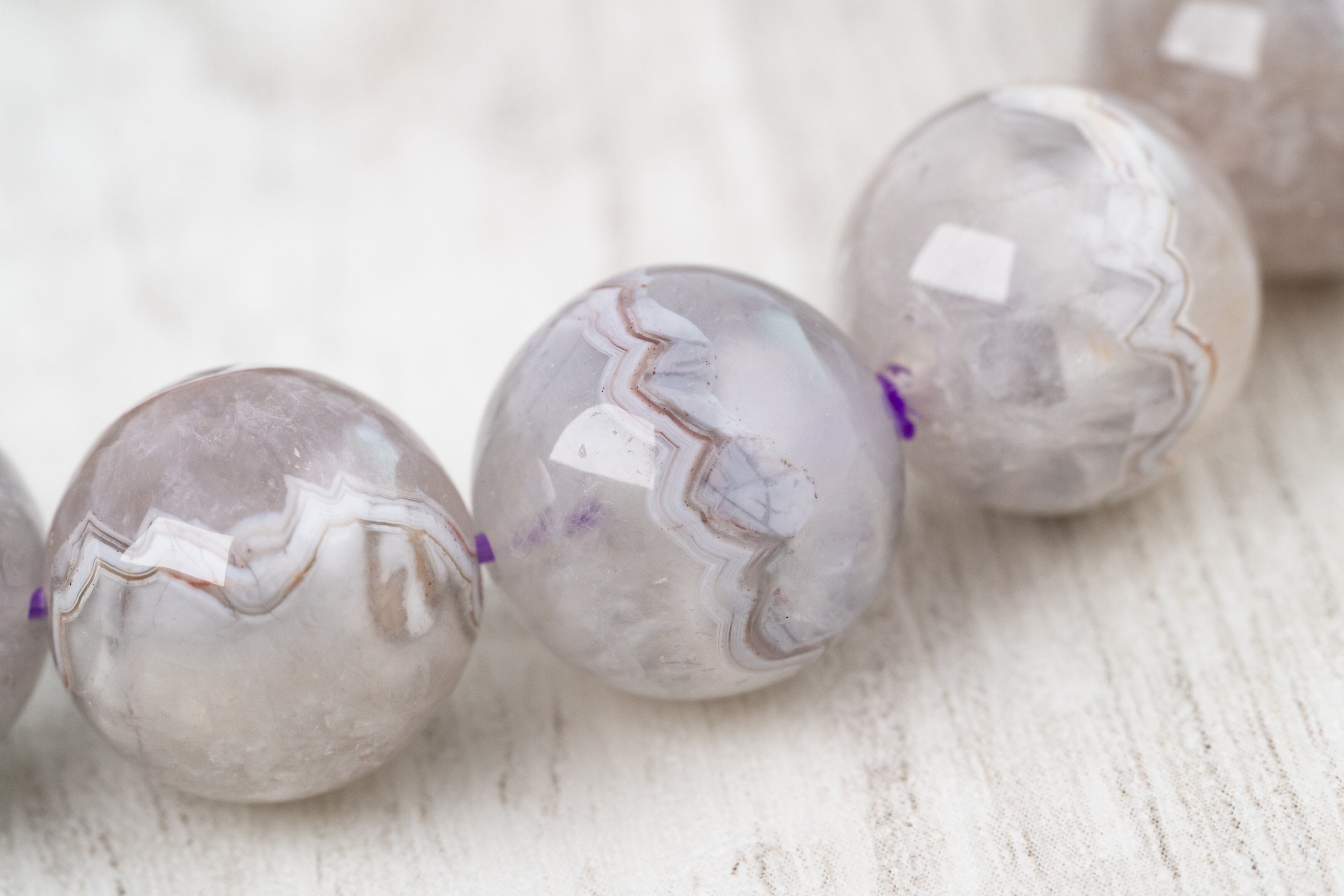通常のクレイジーレースアゲートの持つ複雑で躍動感のある模様に加え、アメジストの成分が混ざり込むことで、淡く美しい紫色を帯びているのが特徴です。