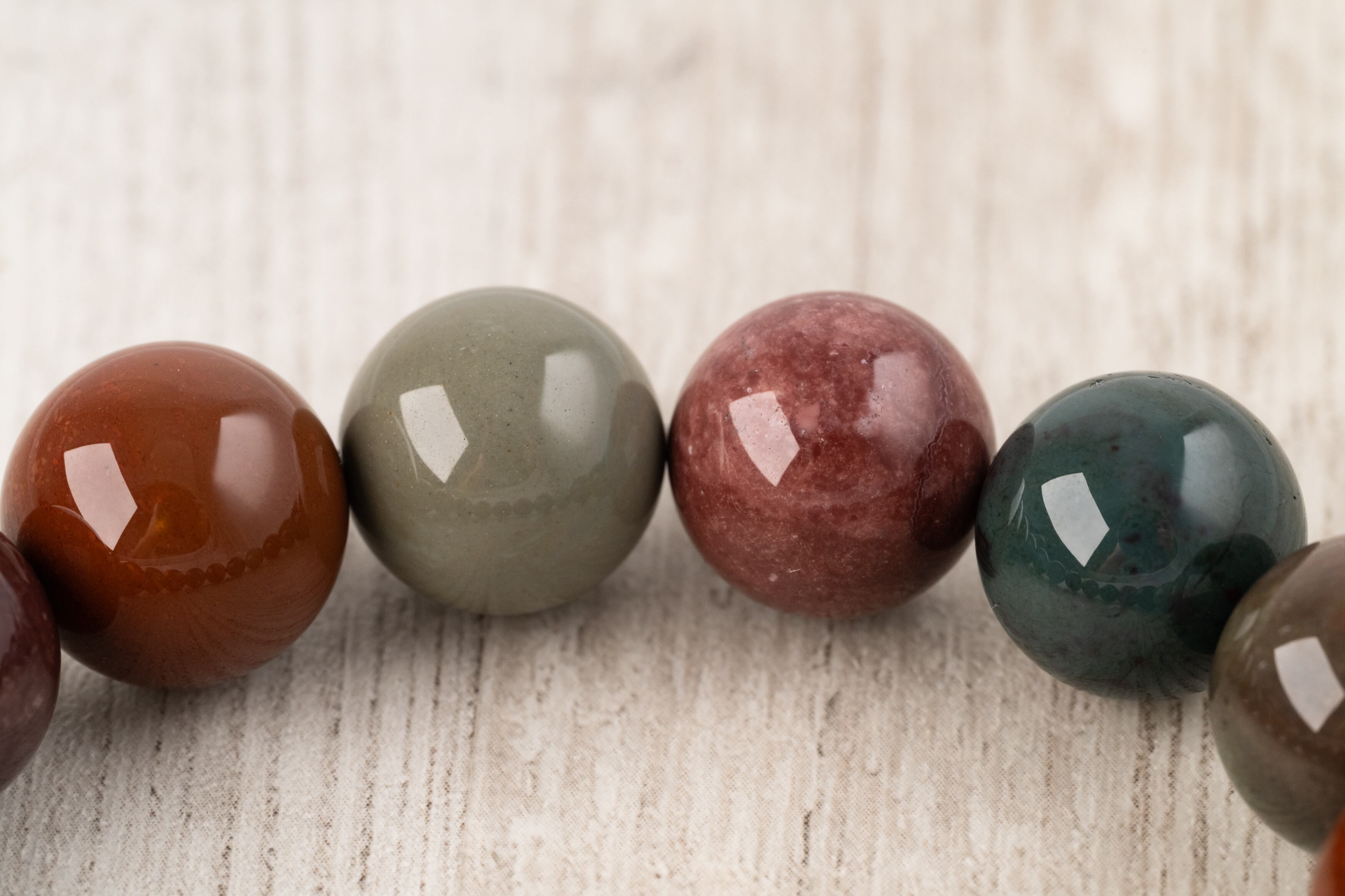数億年の時を経て風化した丸みを帯びた独特の形状と、赤、オレンジ、黄、白、黒など様々な色が織りなす模様が特徴です。