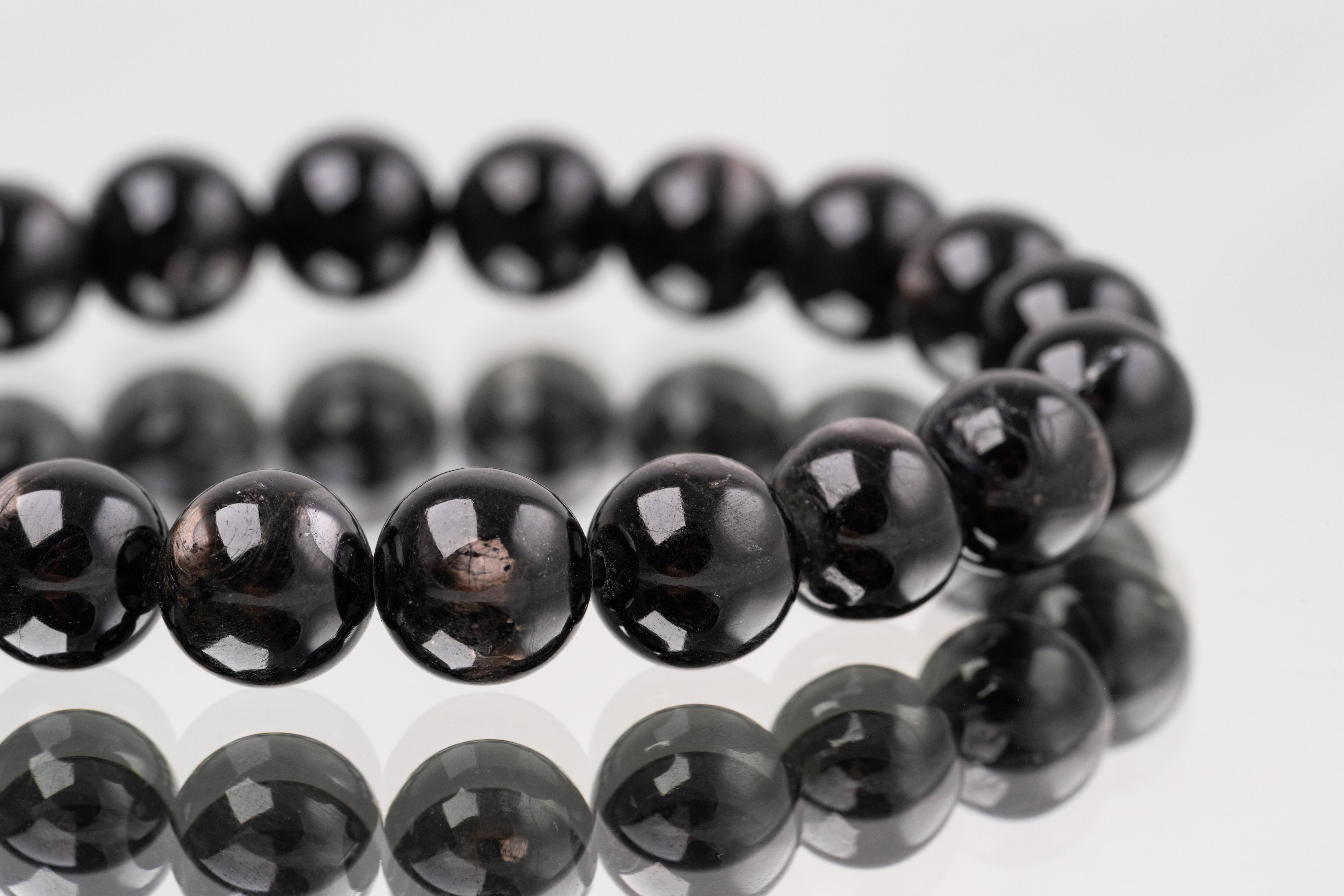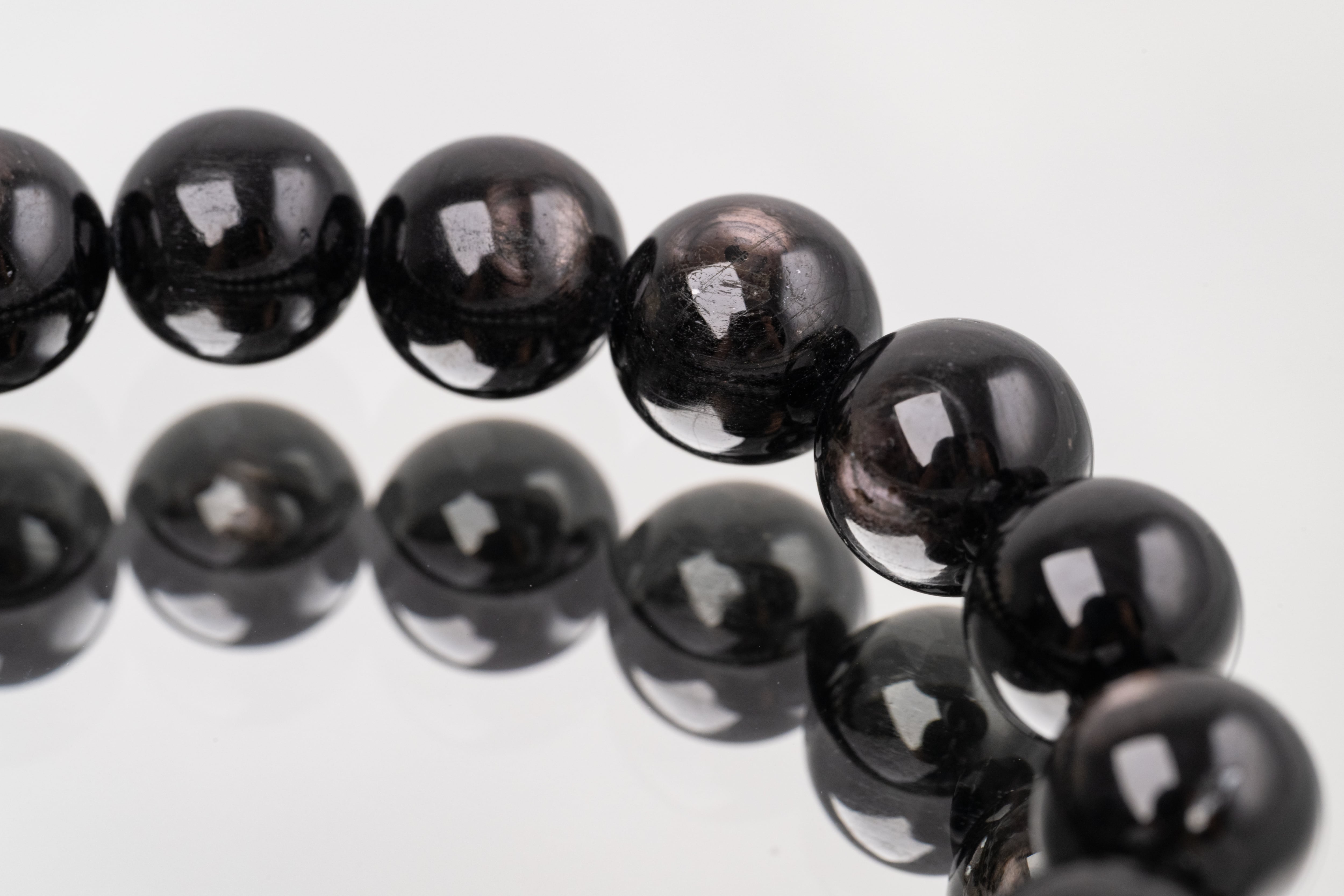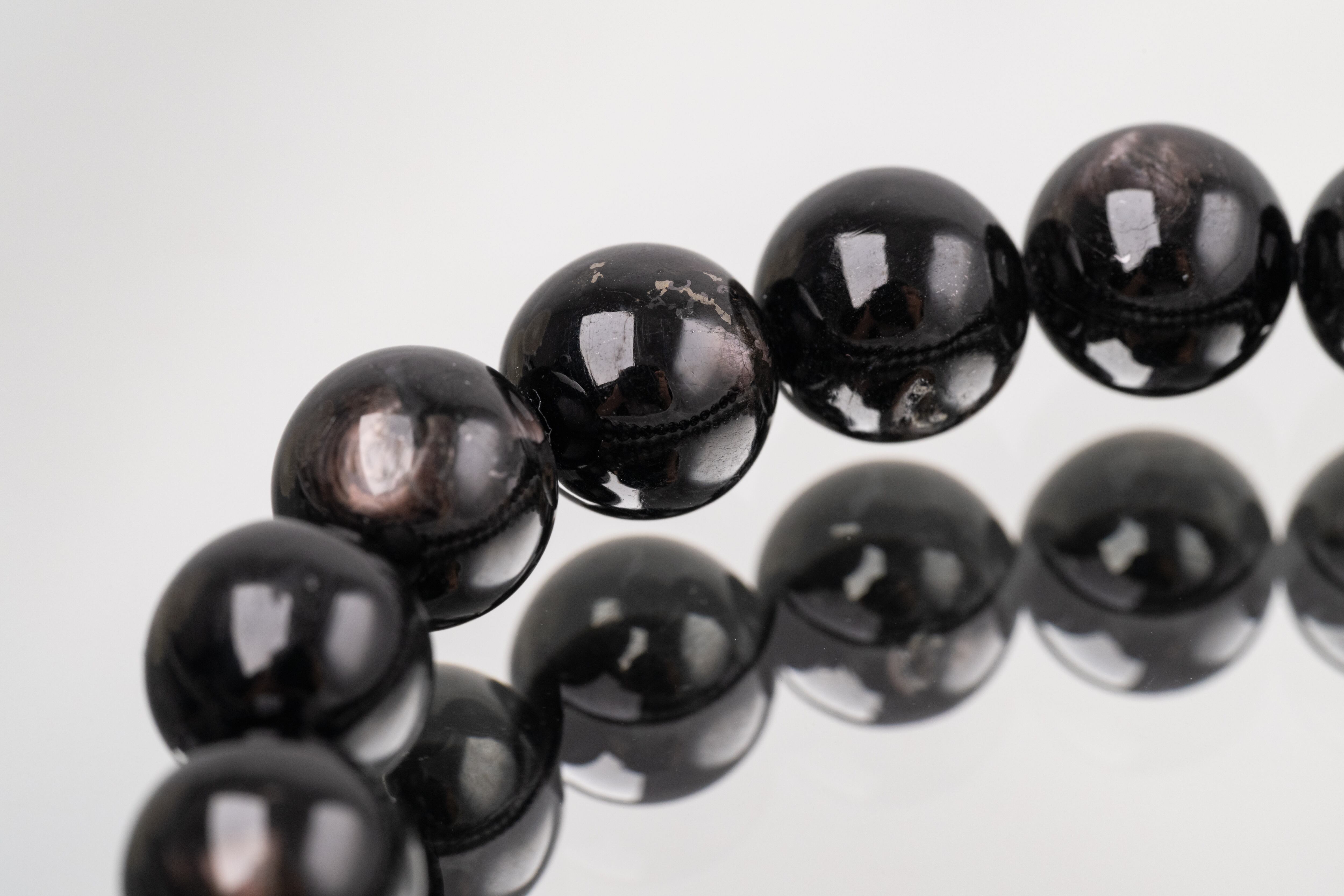 深く濃い色合いの中に見る角度によって銀色やブロンズ色のシラー(光沢)が浮かび上がる神秘的な輝きを持つ天然石です。