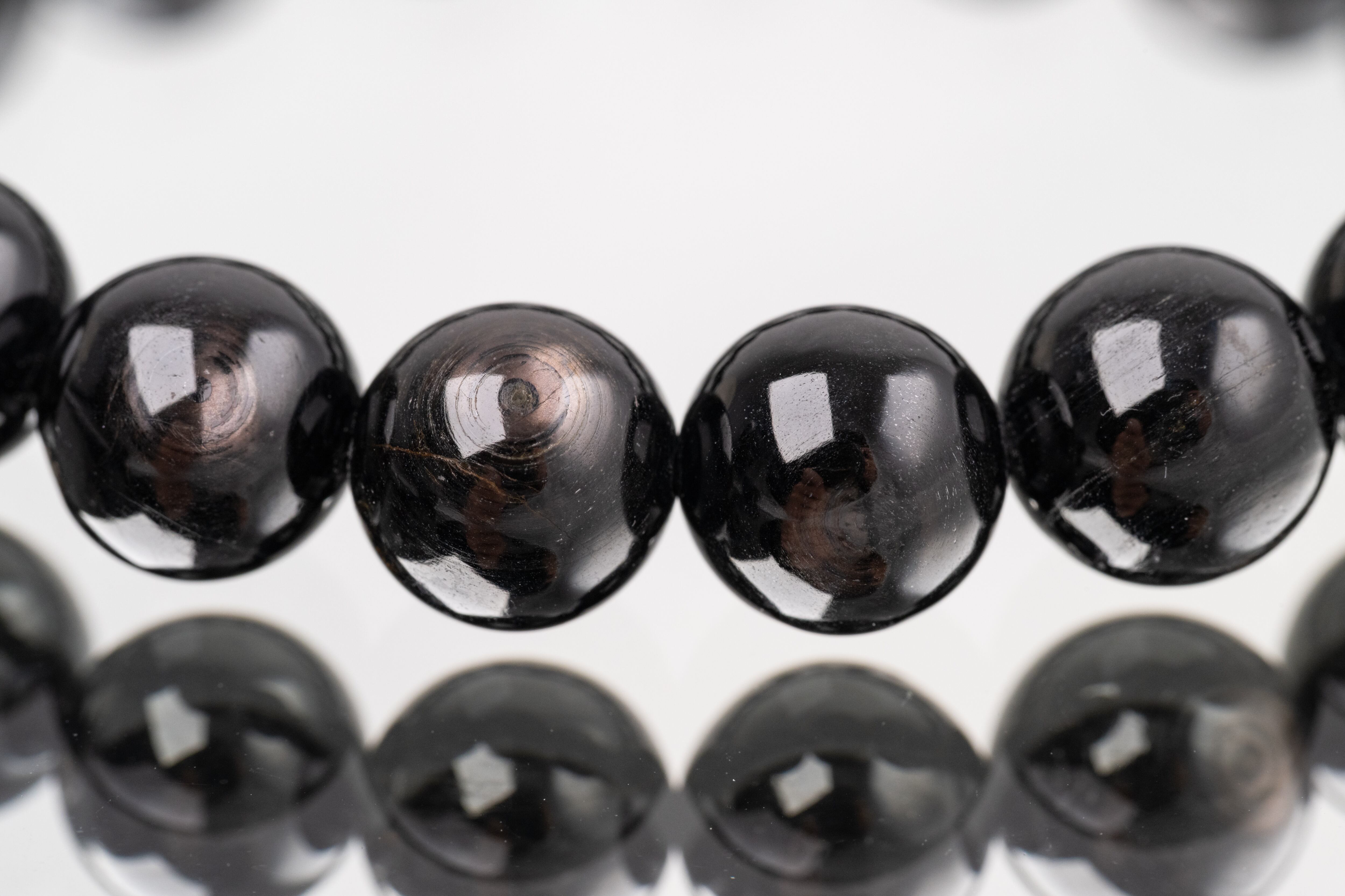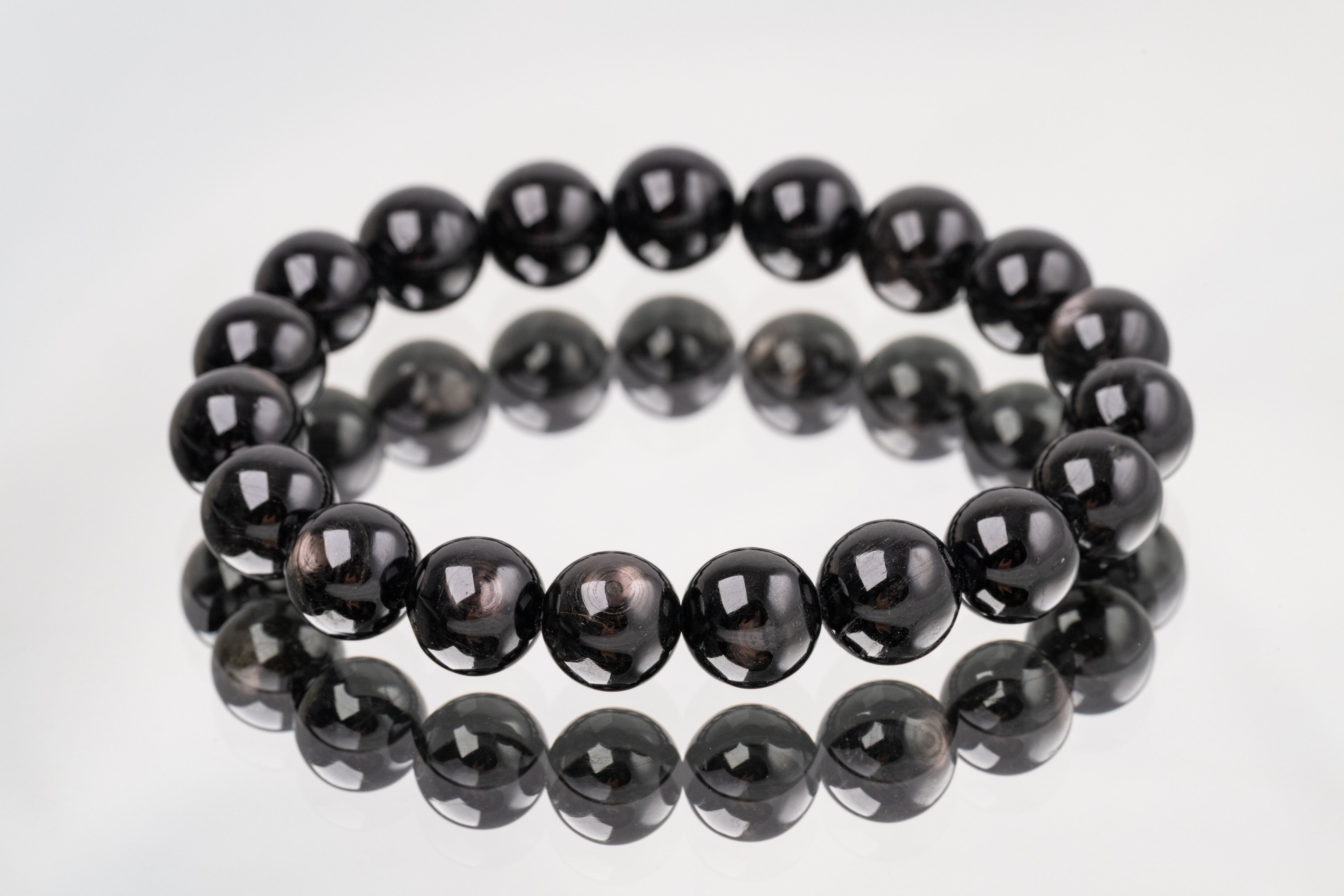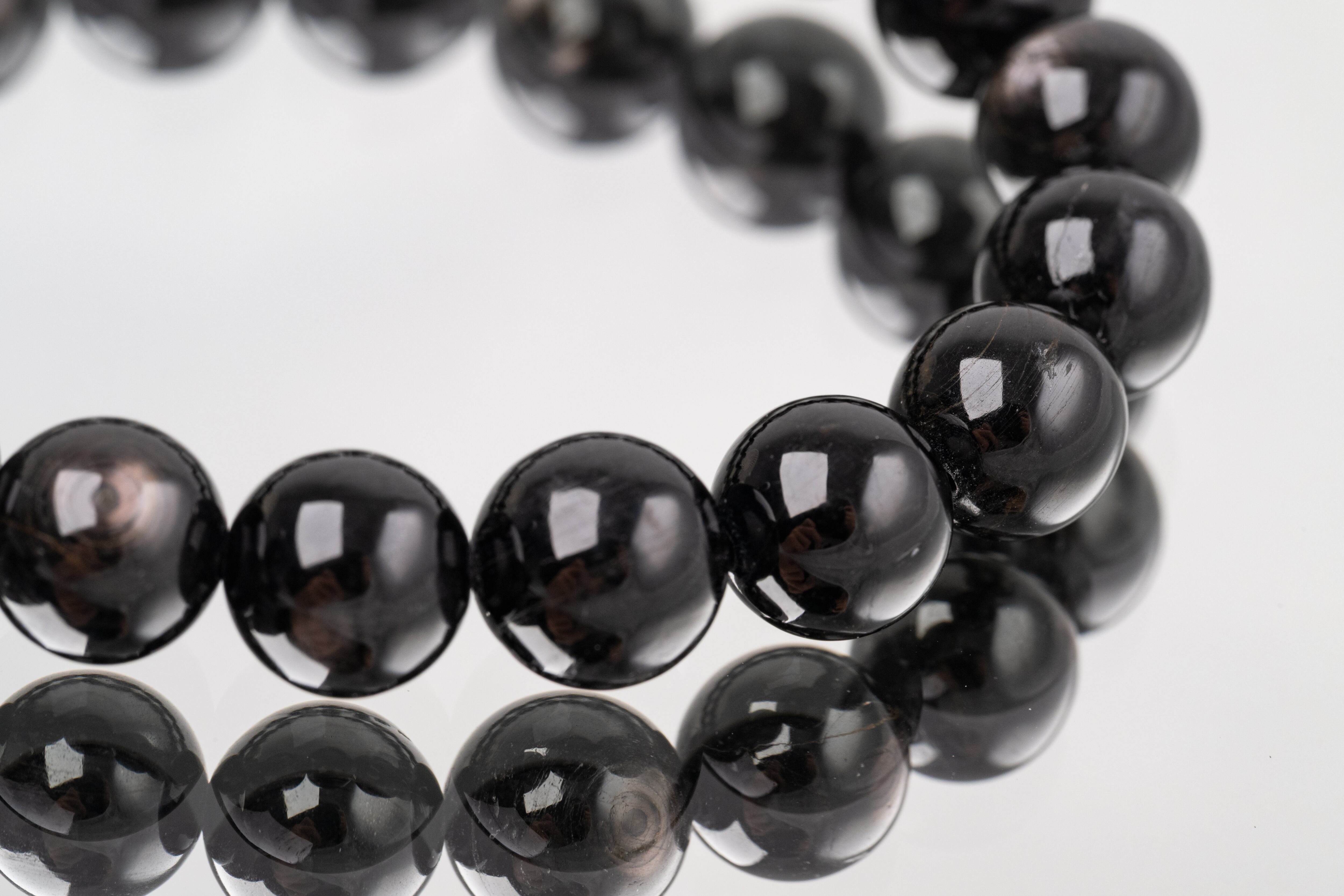 深く濃い色合いの中に見る角度によって銀色やブロンズ色のシラー(光沢)が浮かび上がる神秘的な輝きを持つ天然石です。