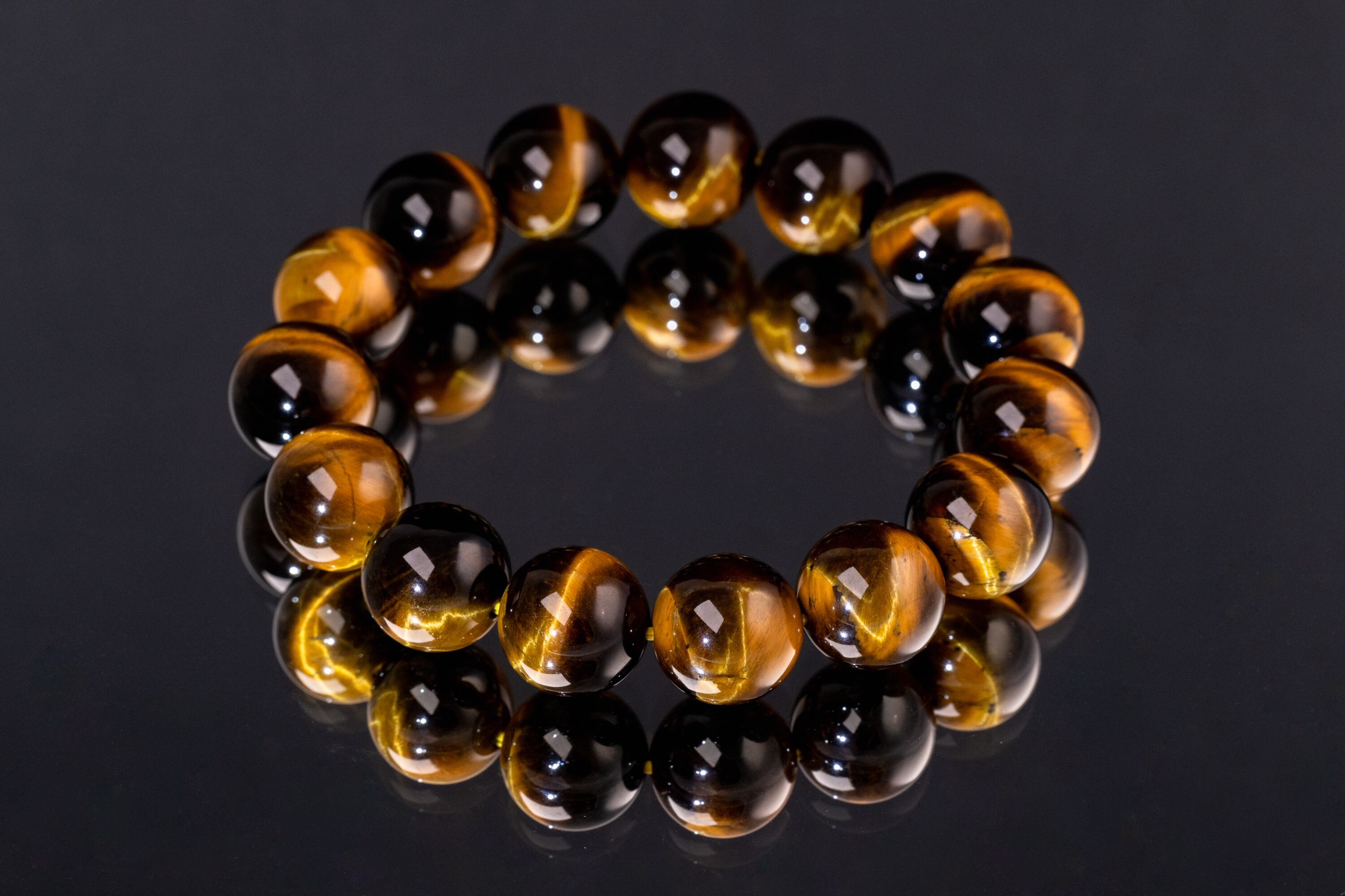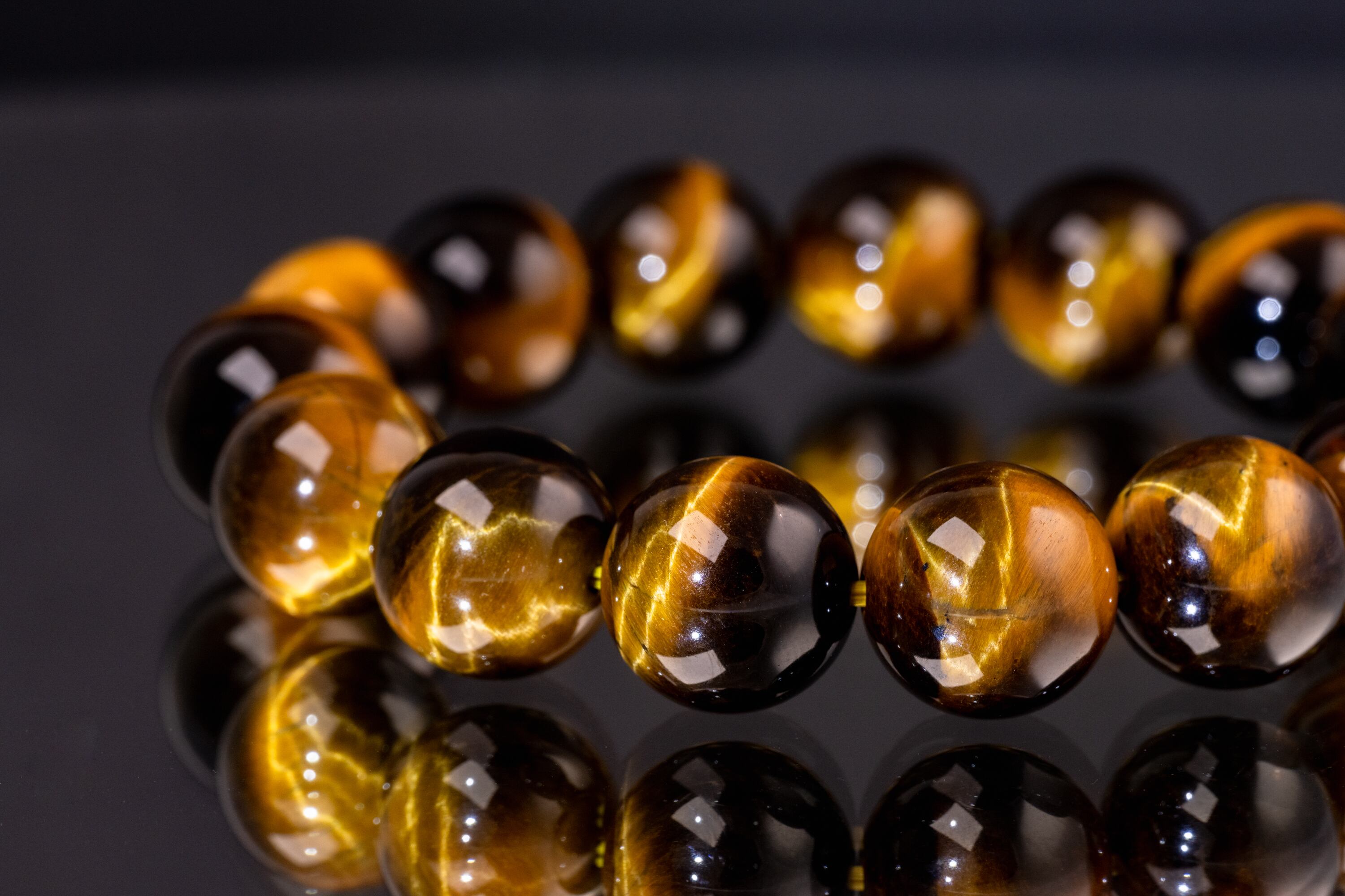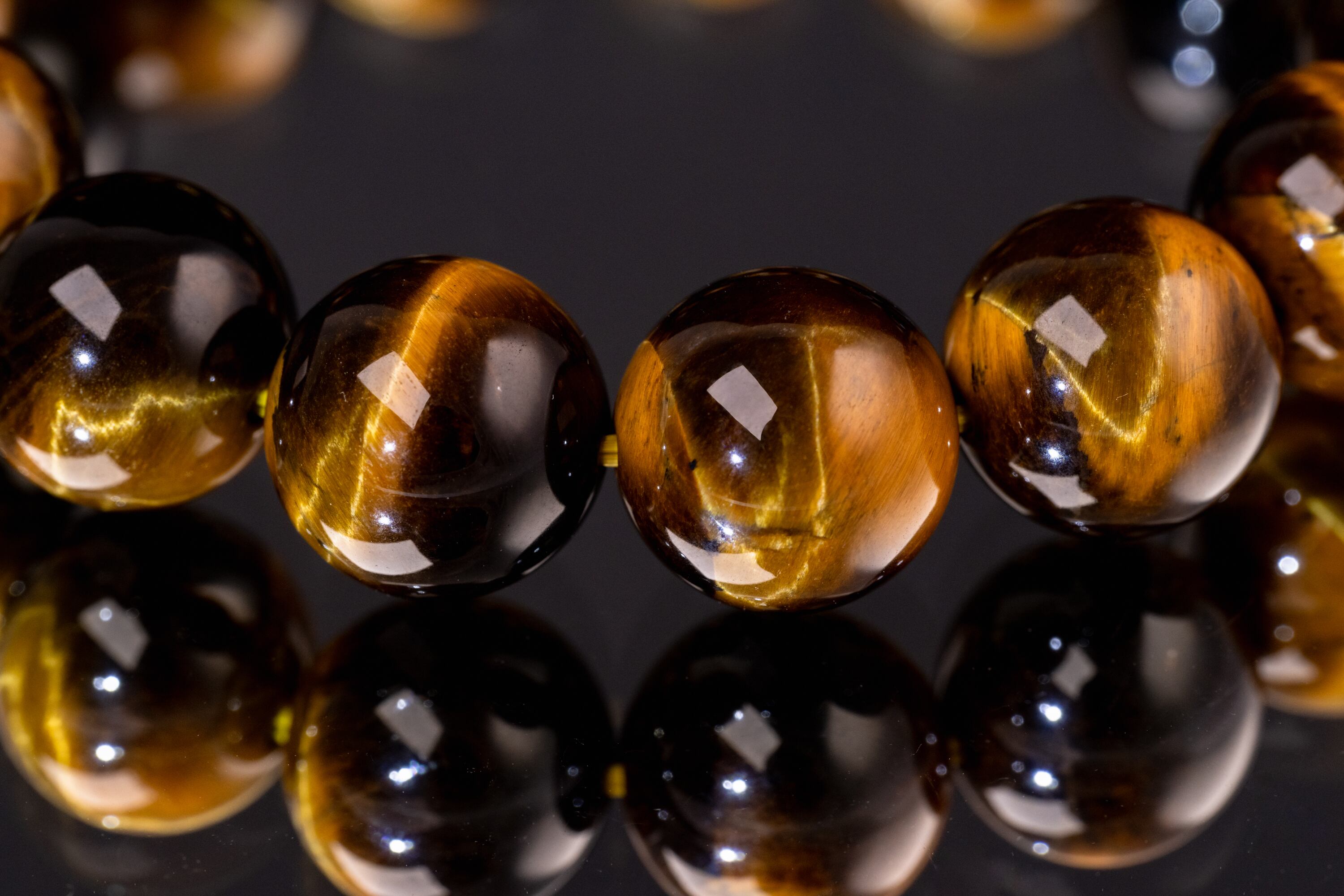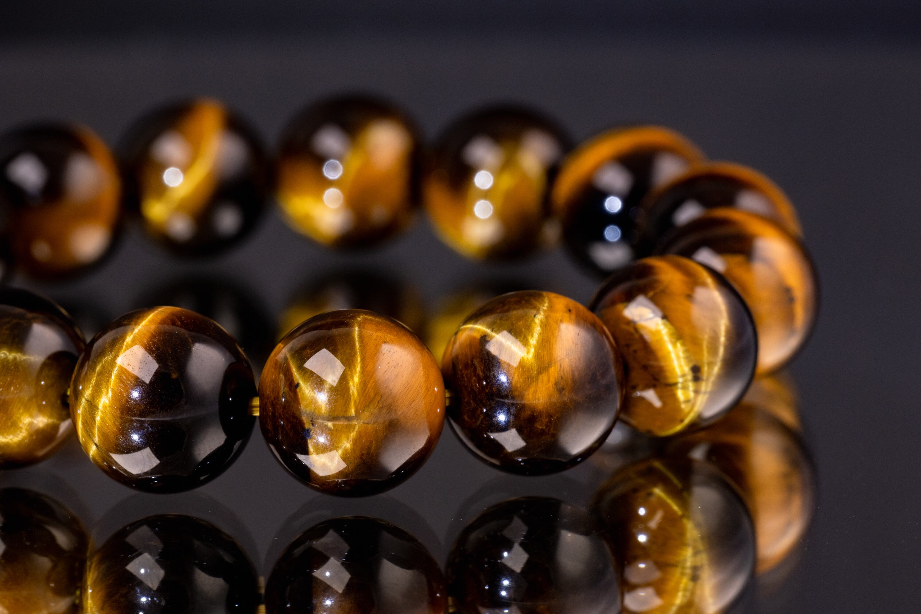 主に南アフリカ等で産出されるタイガーアイは、石英にクロシドライトという鉱物が染み込み、酸化することで特有の黄金色と茶褐色の縞模様が生まれる天然石です。