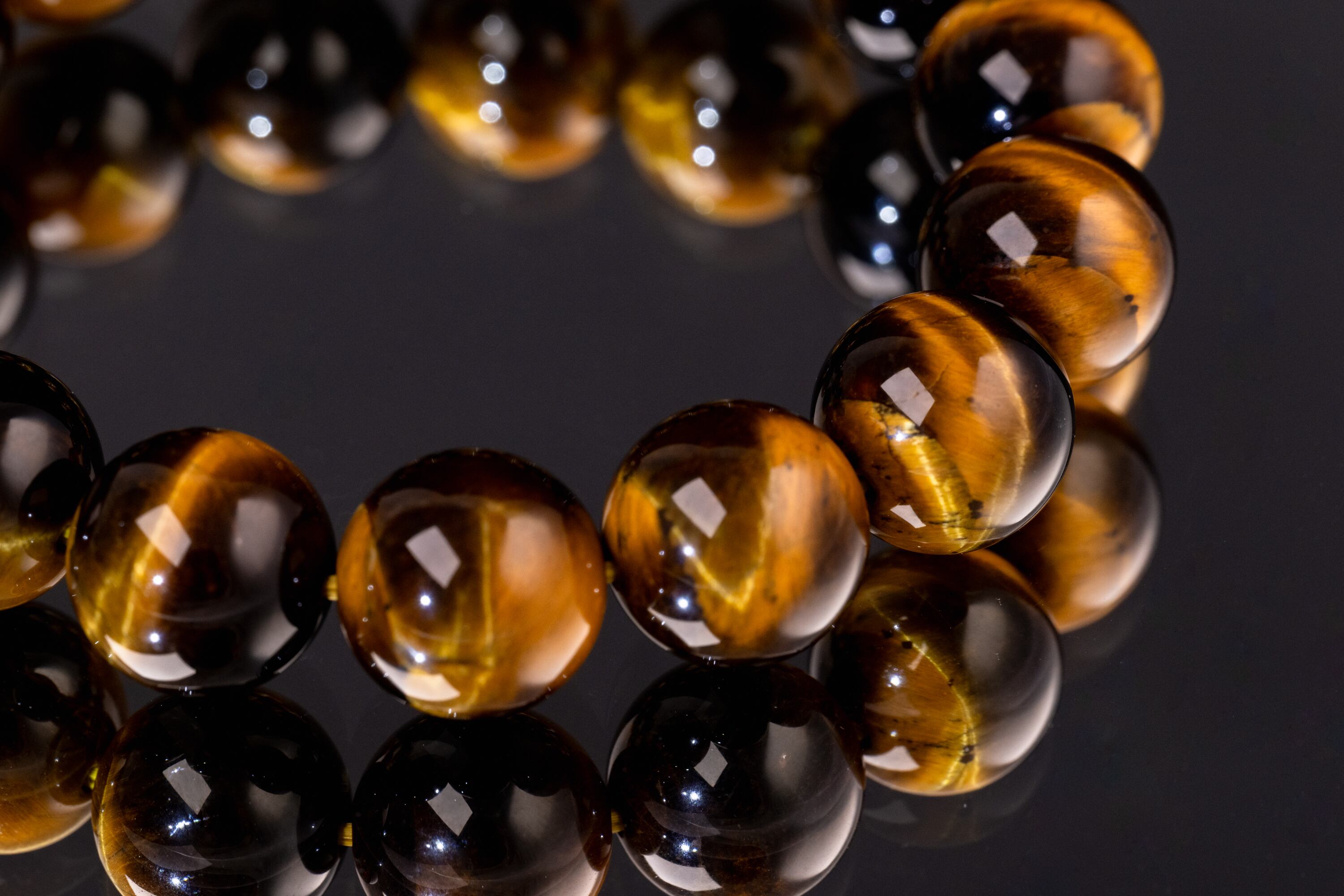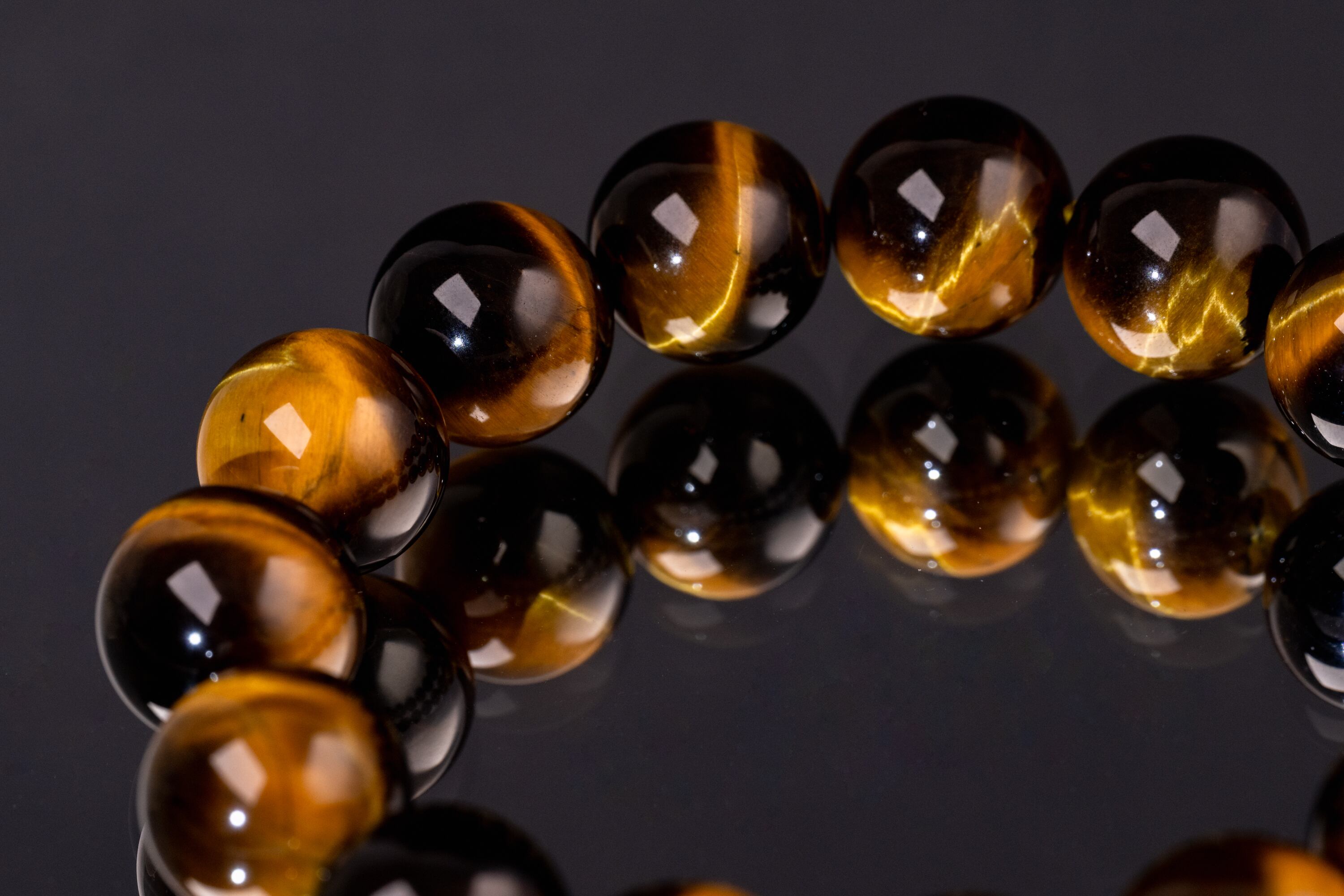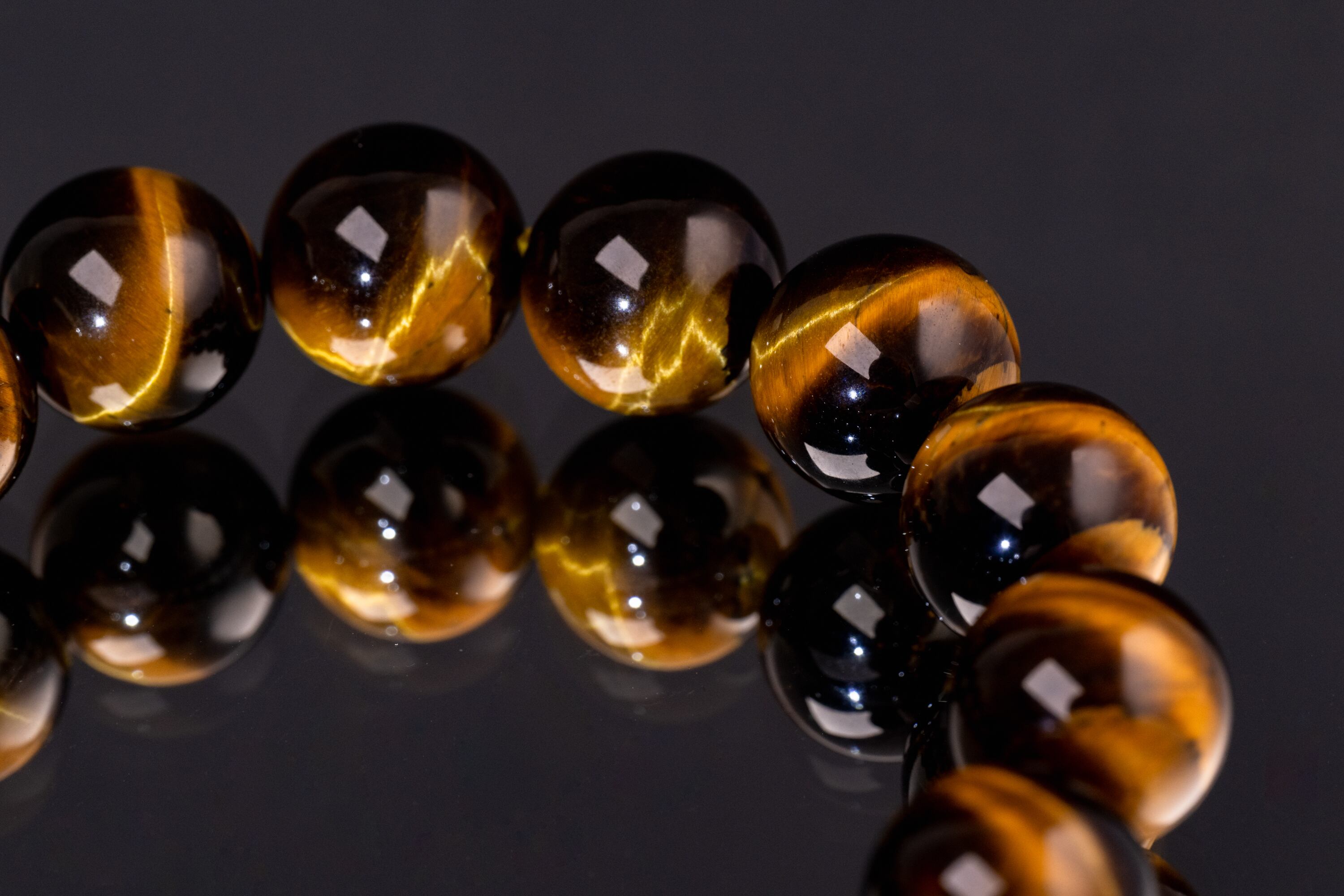 主に南アフリカ等で産出されるタイガーアイは、石英にクロシドライトという鉱物が染み込み、酸化することで特有の黄金色と茶褐色の縞模様が生まれる天然石です。