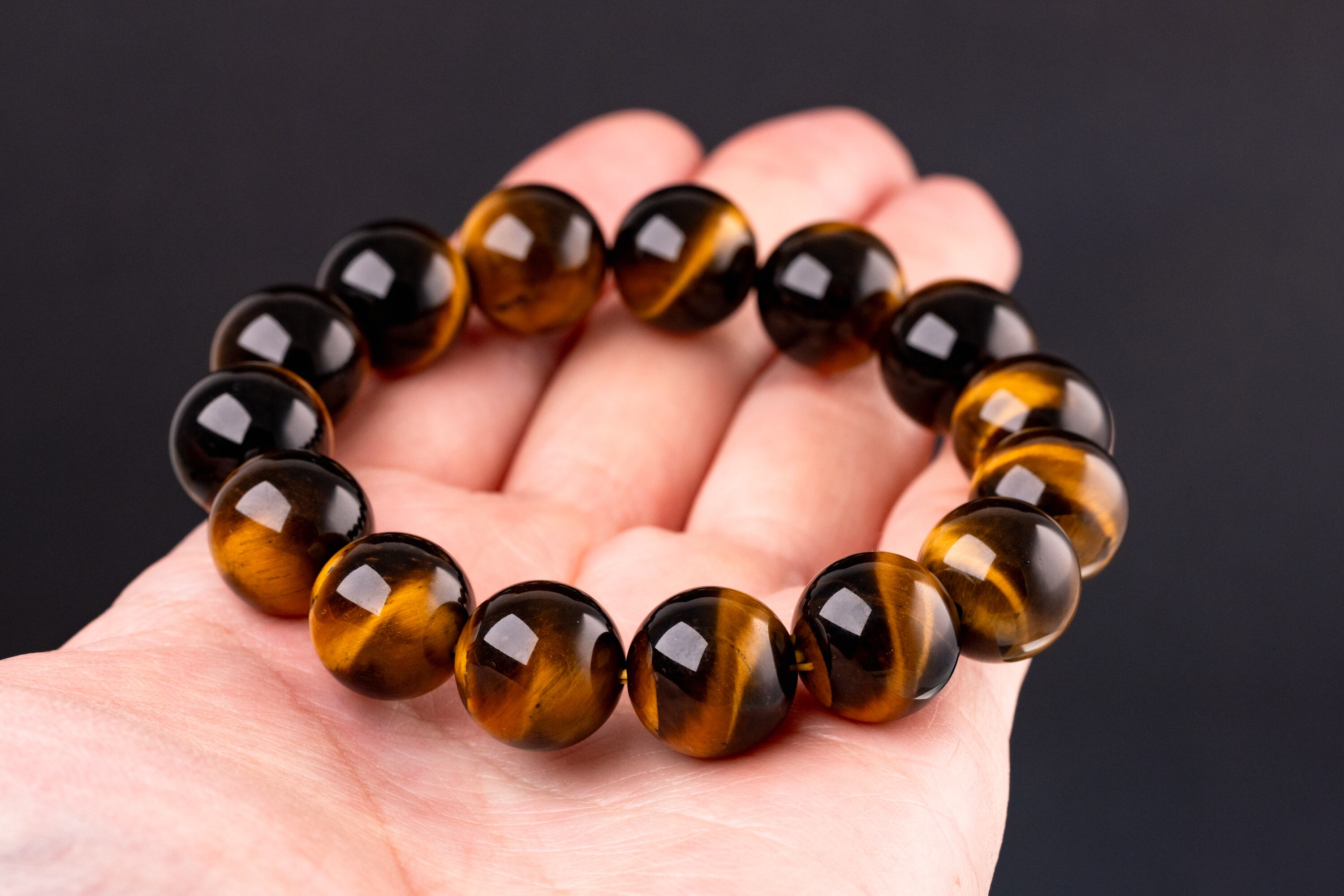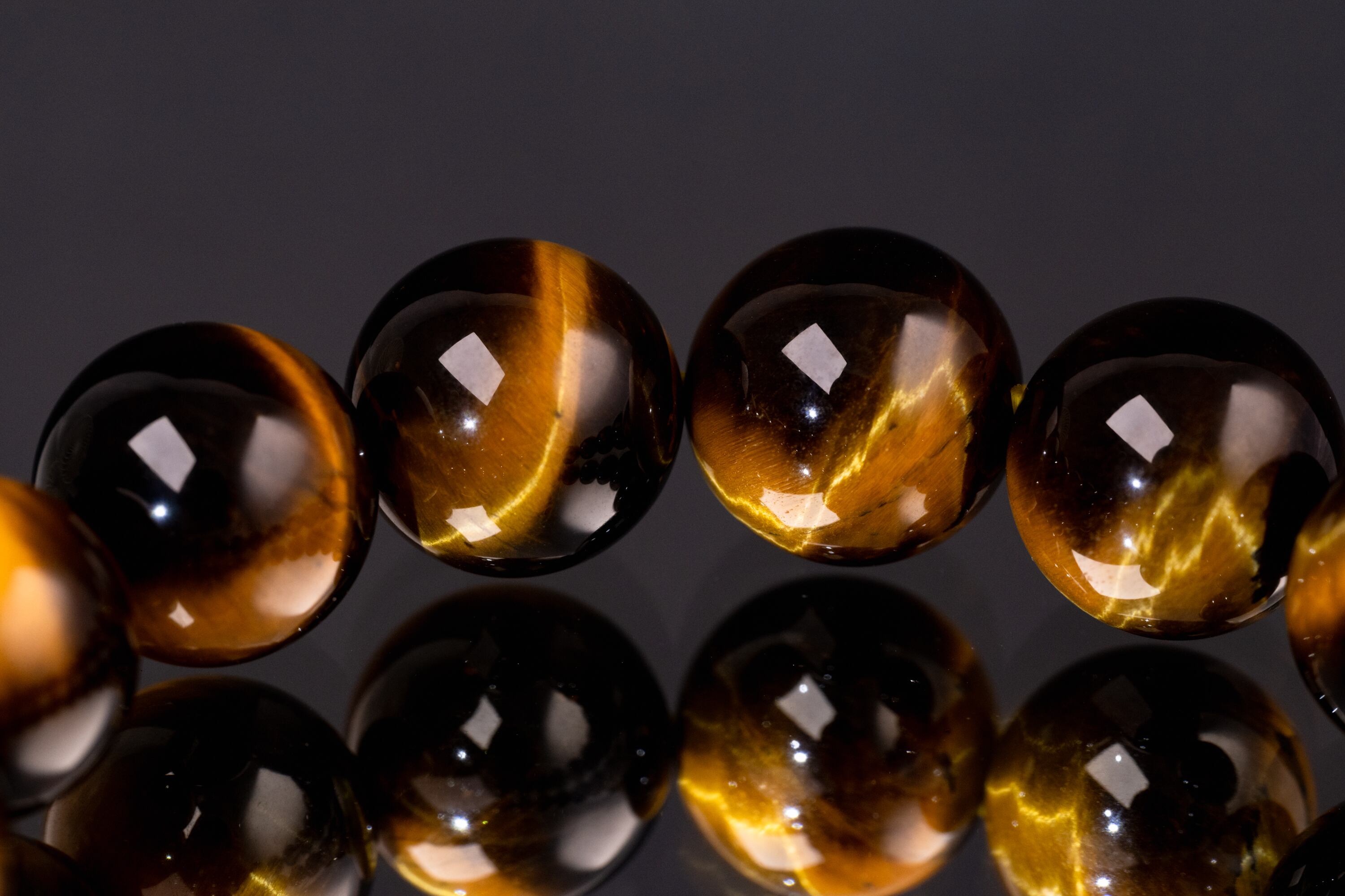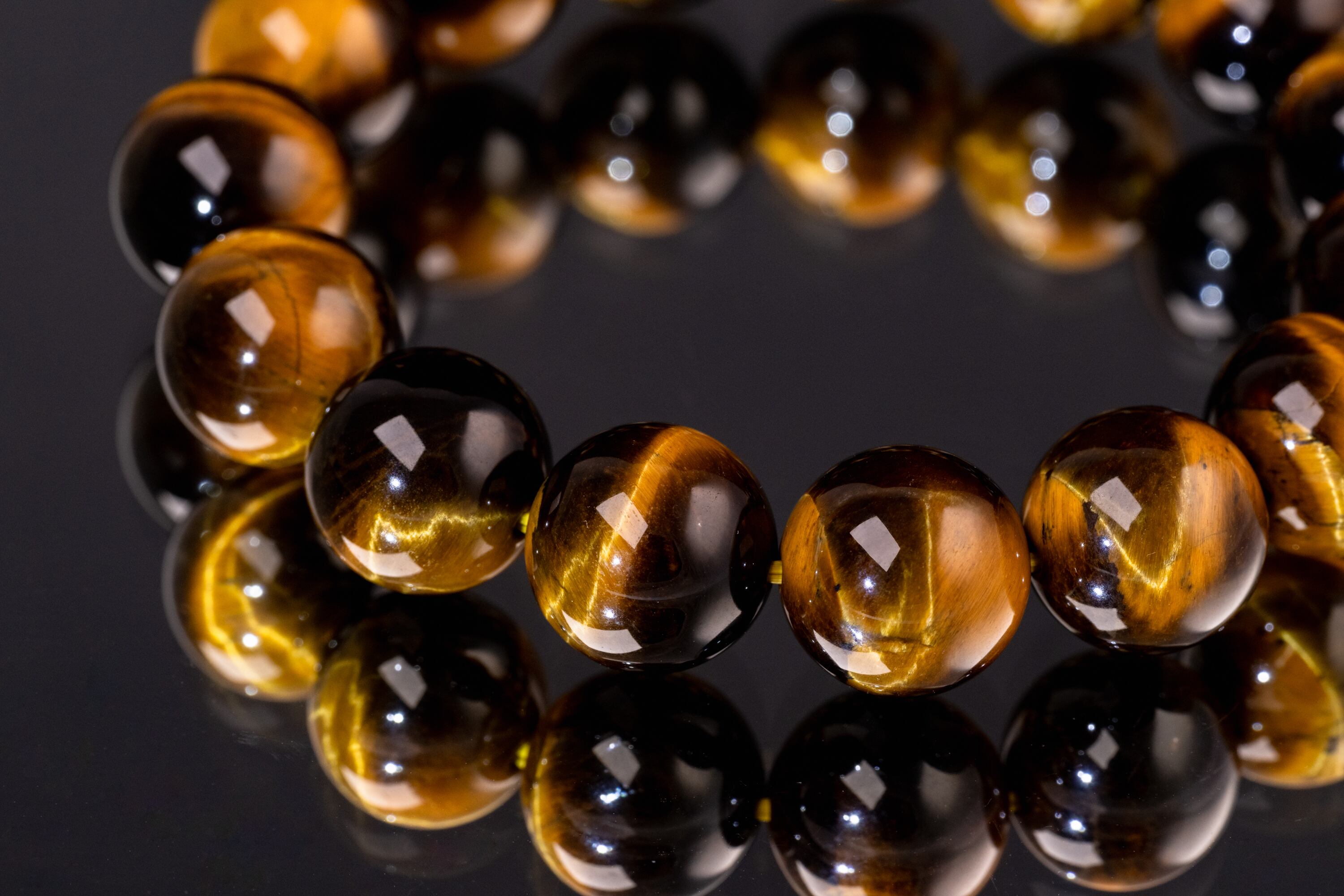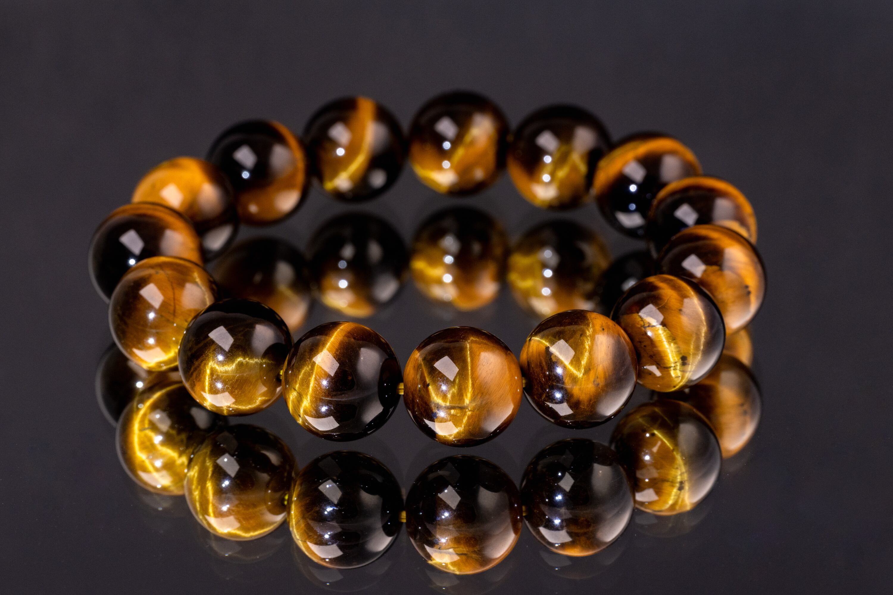 主に南アフリカ等で産出されるタイガーアイは、石英にクロシドライトという鉱物が染み込み、酸化することで特有の黄金色と茶褐色の縞模様が生まれる天然石です。