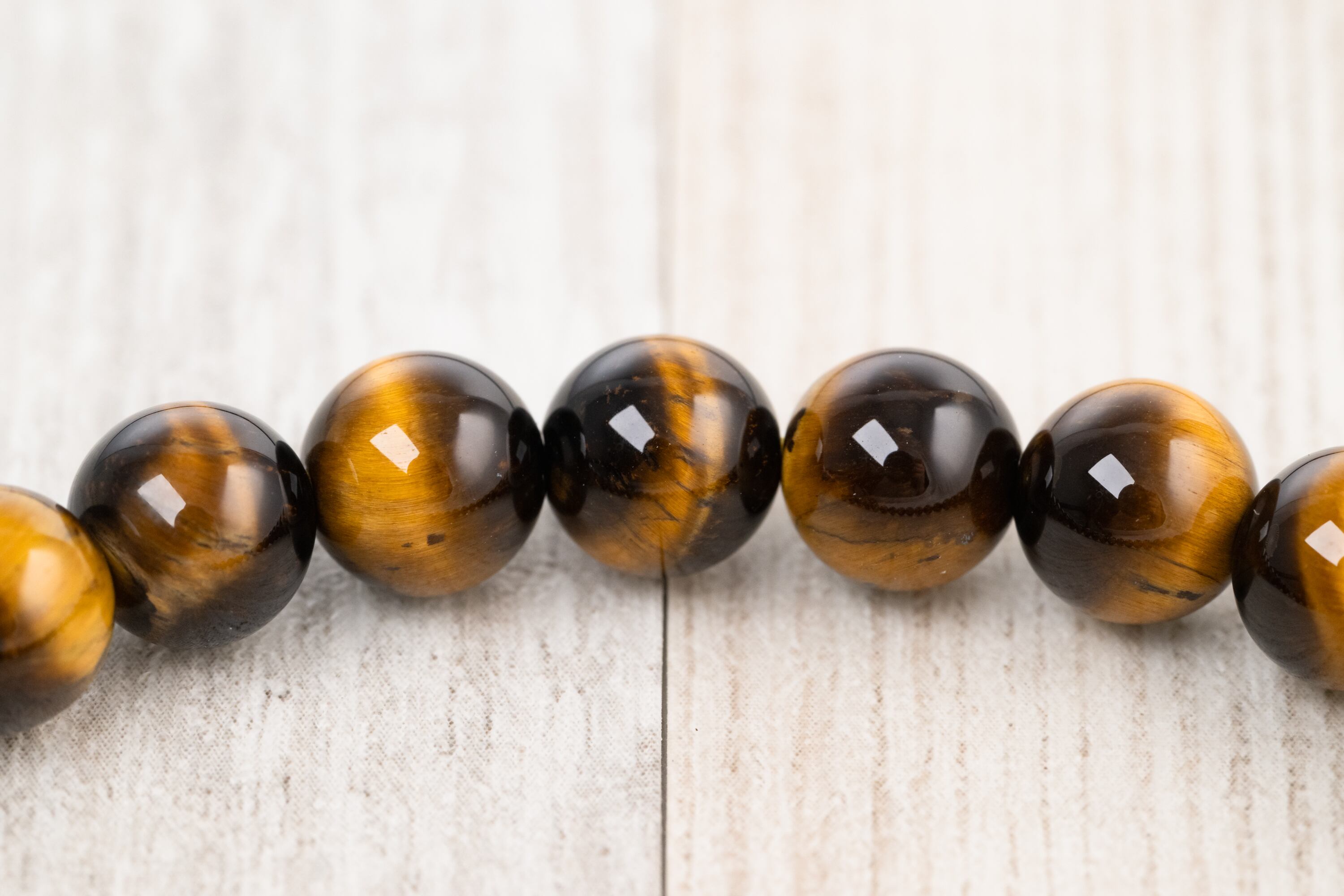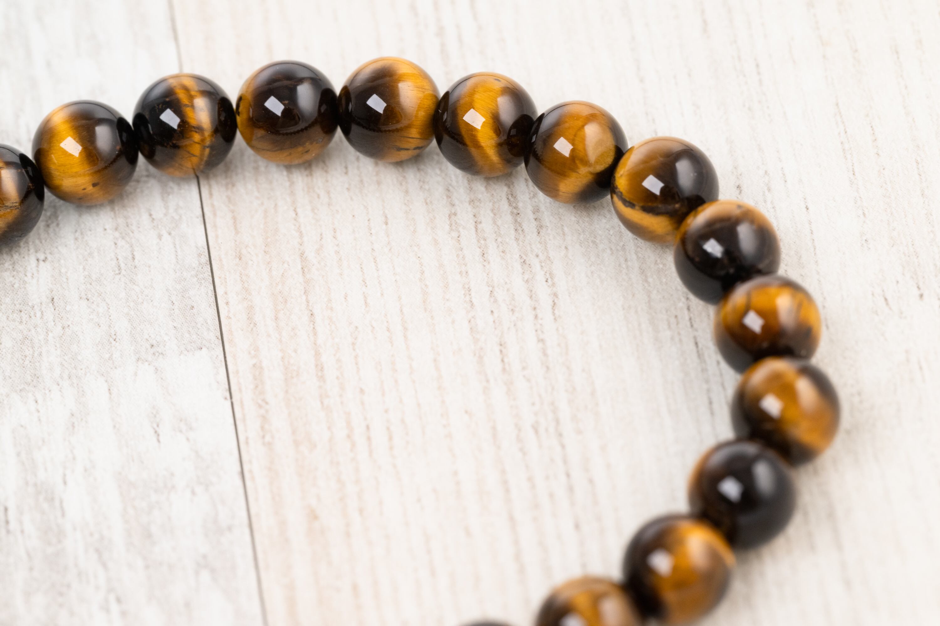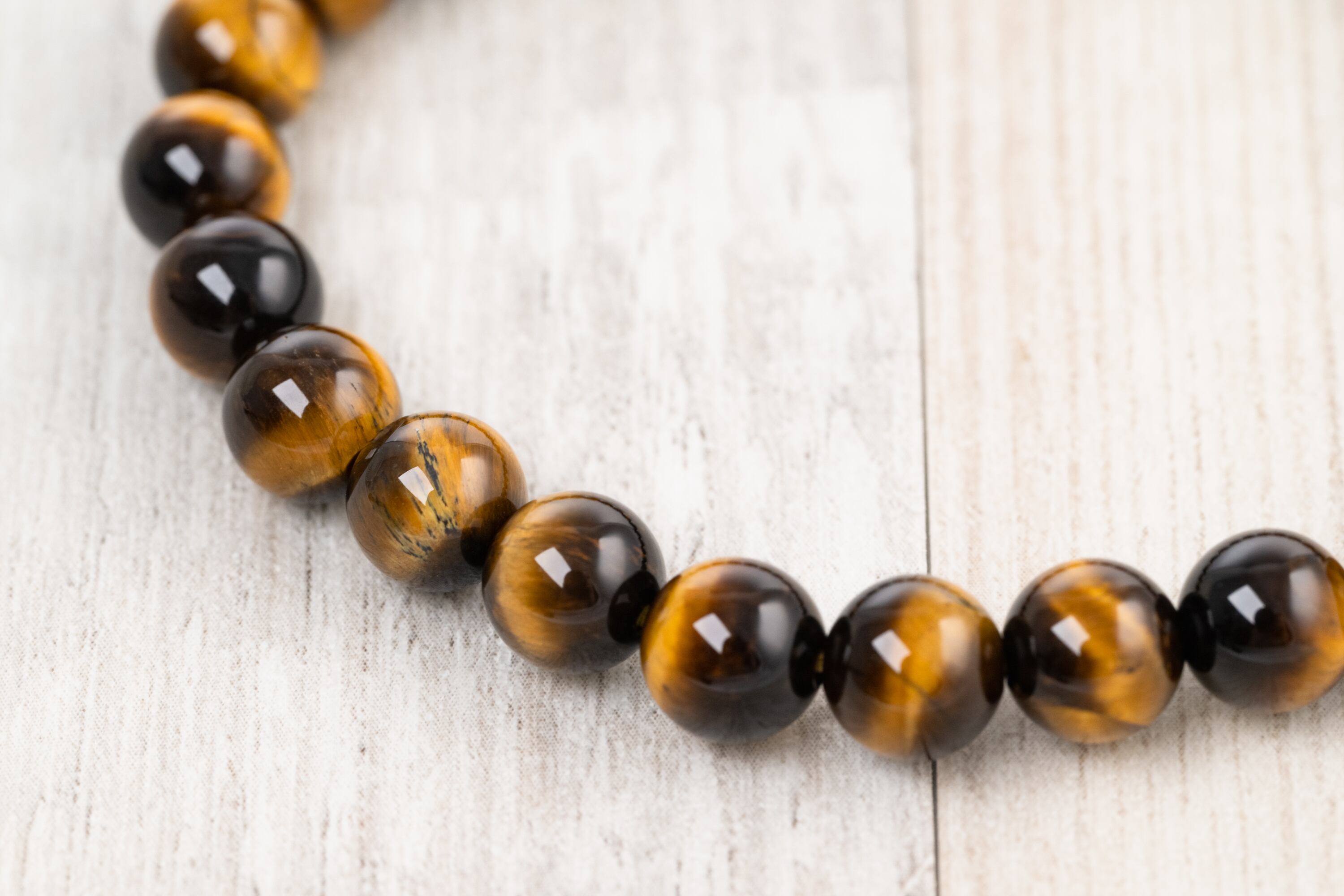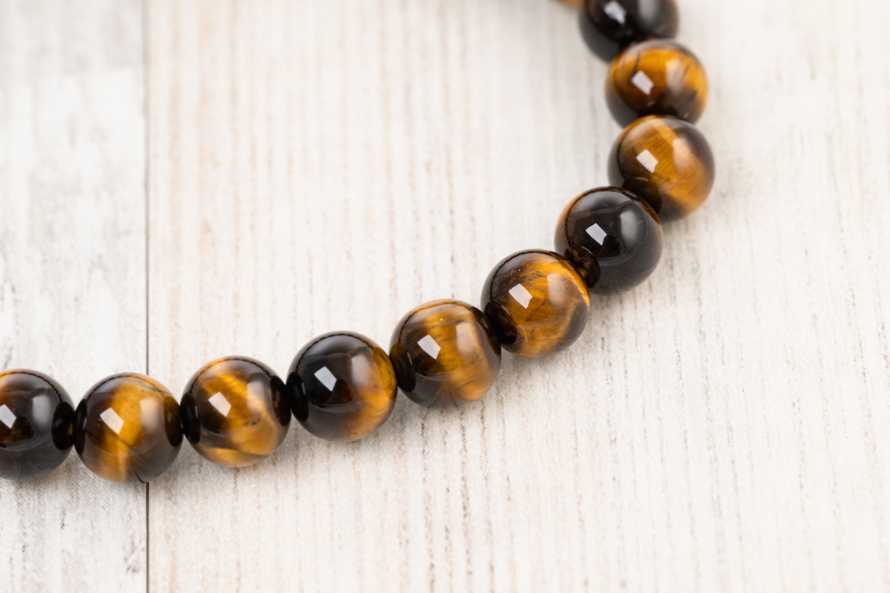 主に南アフリカ等で産出されるタイガーアイは、石英にクロシドライトという鉱物が染み込み、酸化することで特有の黄金色と茶褐色の縞模様が生まれる天然石です。