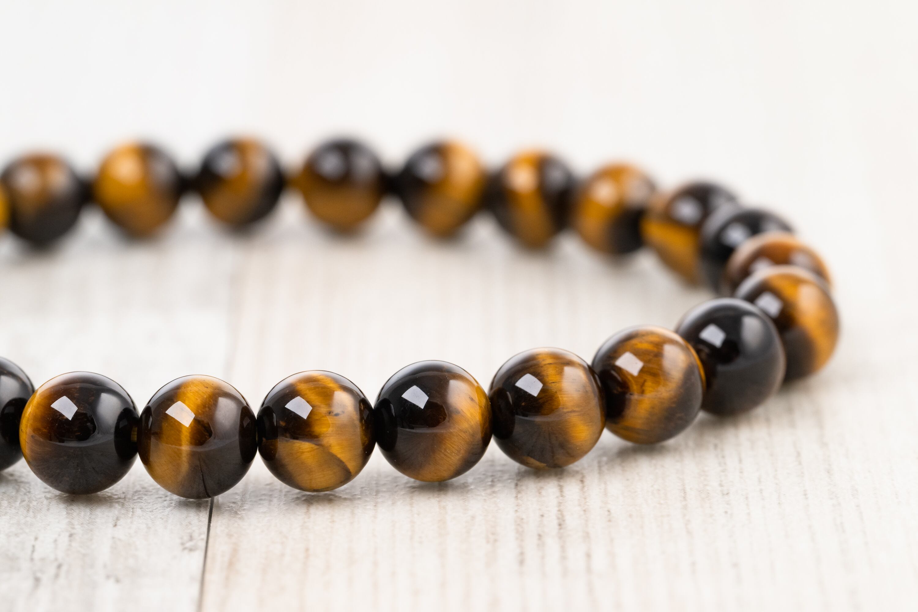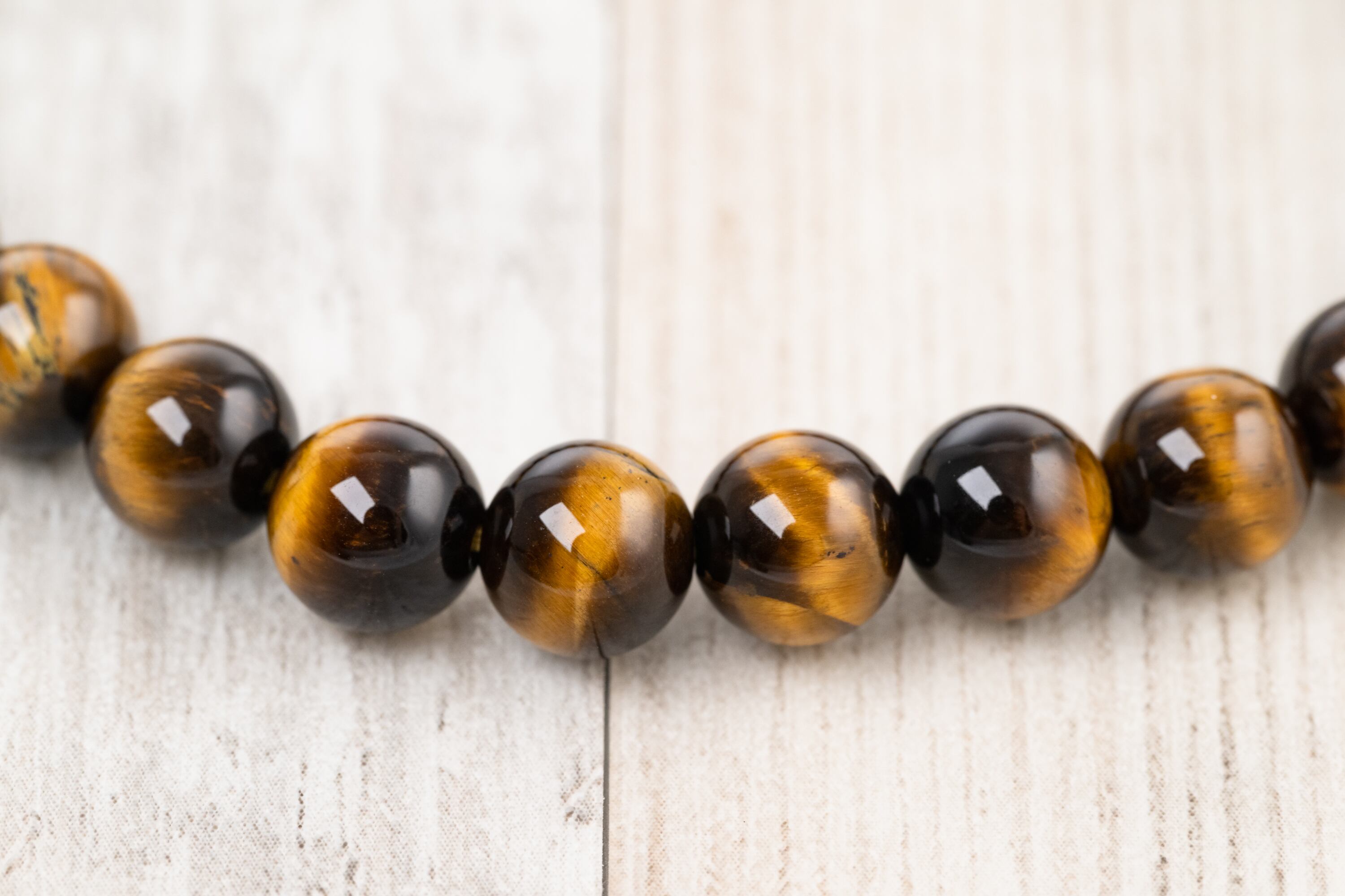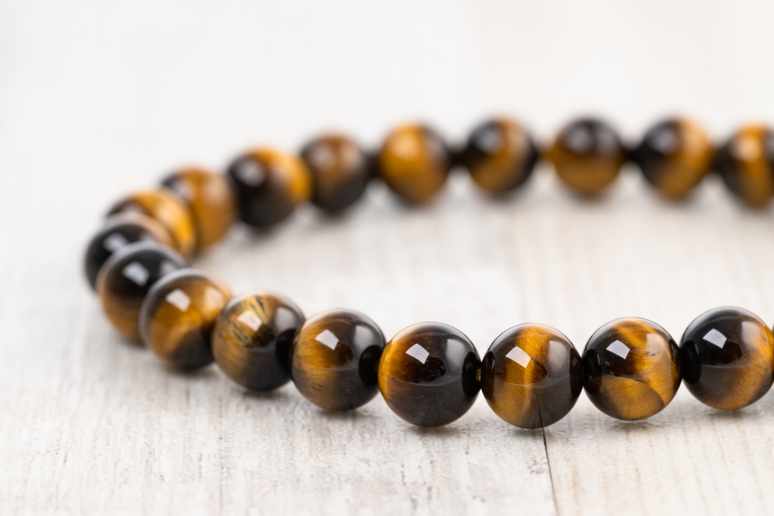 主に南アフリカ等で産出されるタイガーアイは、石英にクロシドライトという鉱物が染み込み、酸化することで特有の黄金色と茶褐色の縞模様が生まれる天然石です。