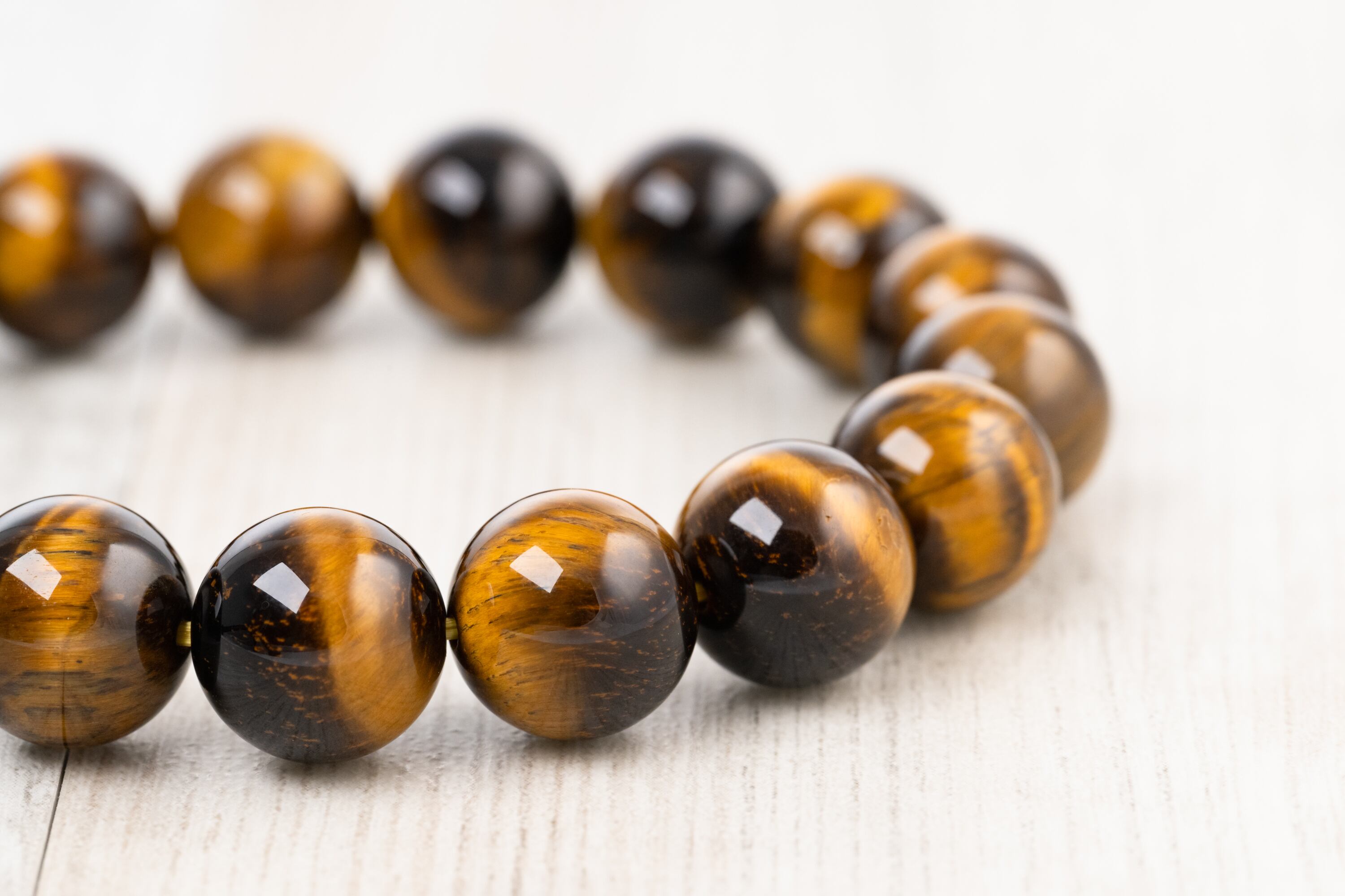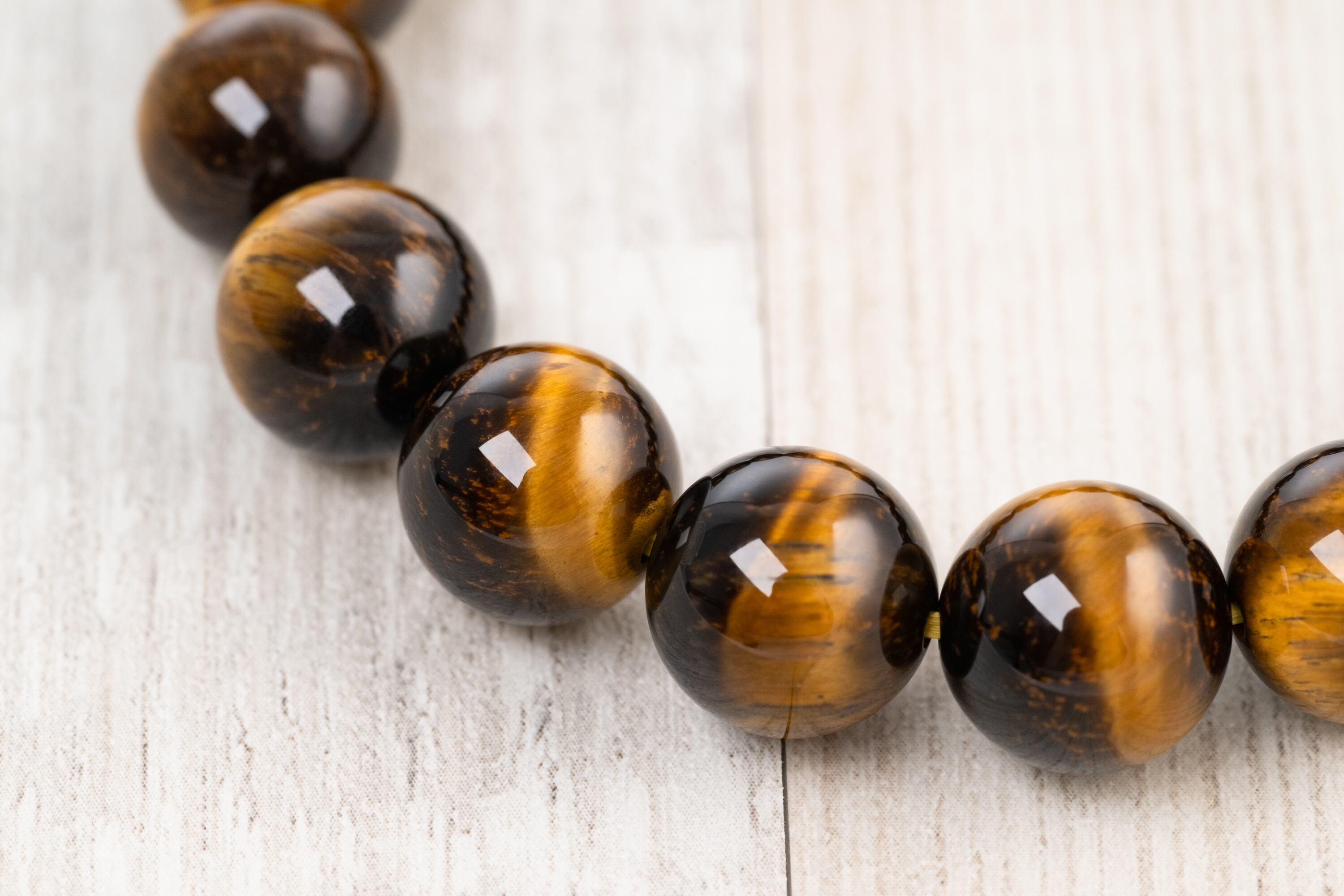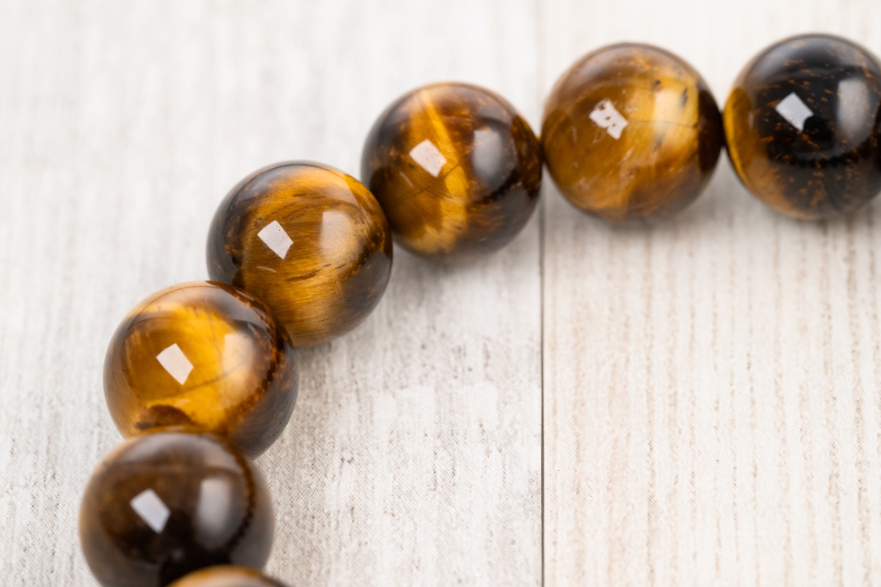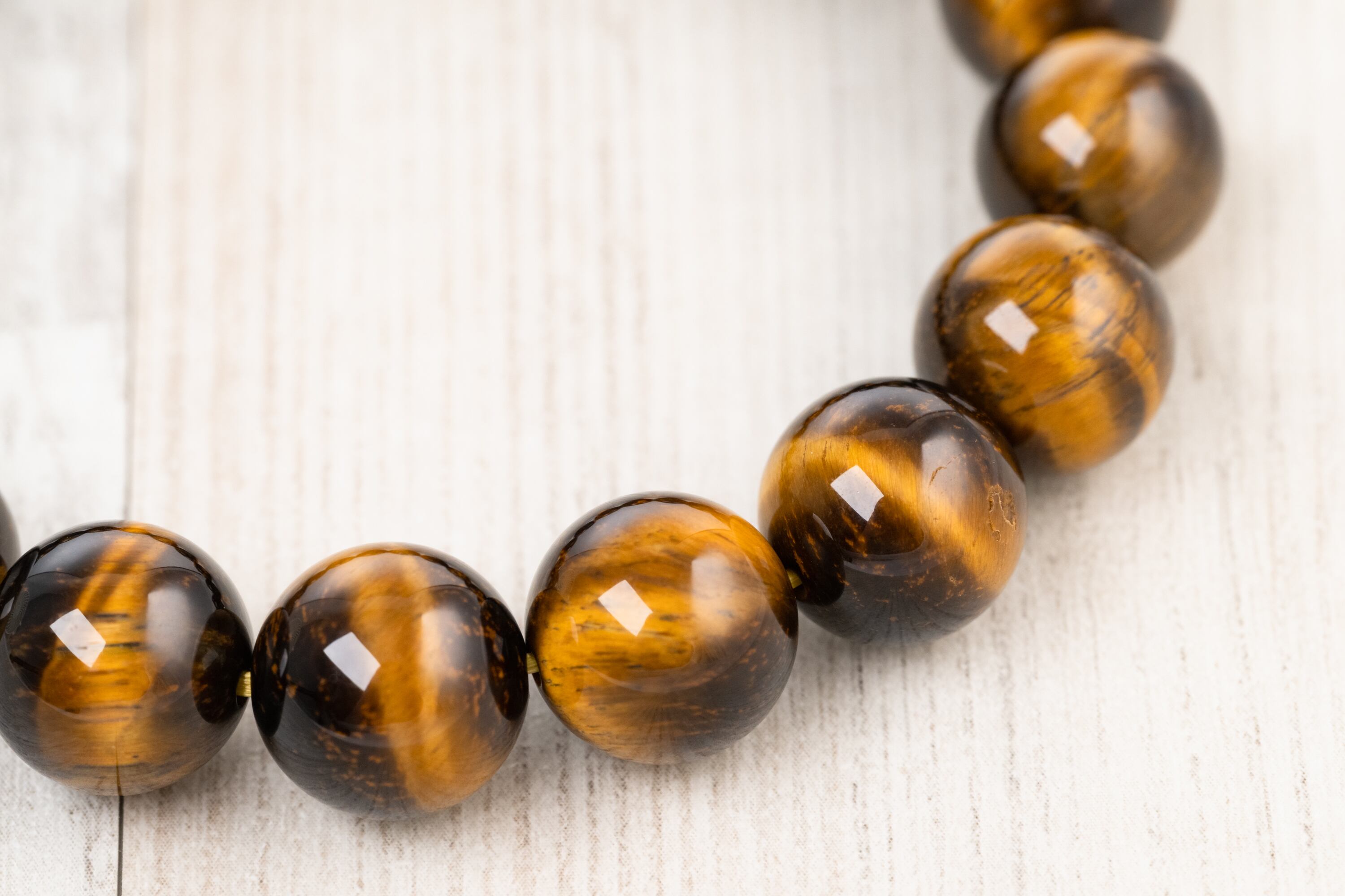 主に南アフリカ等で産出されるタイガーアイは、石英にクロシドライトという鉱物が染み込み、酸化することで特有の黄金色と茶褐色の縞模様が生まれる天然石です。