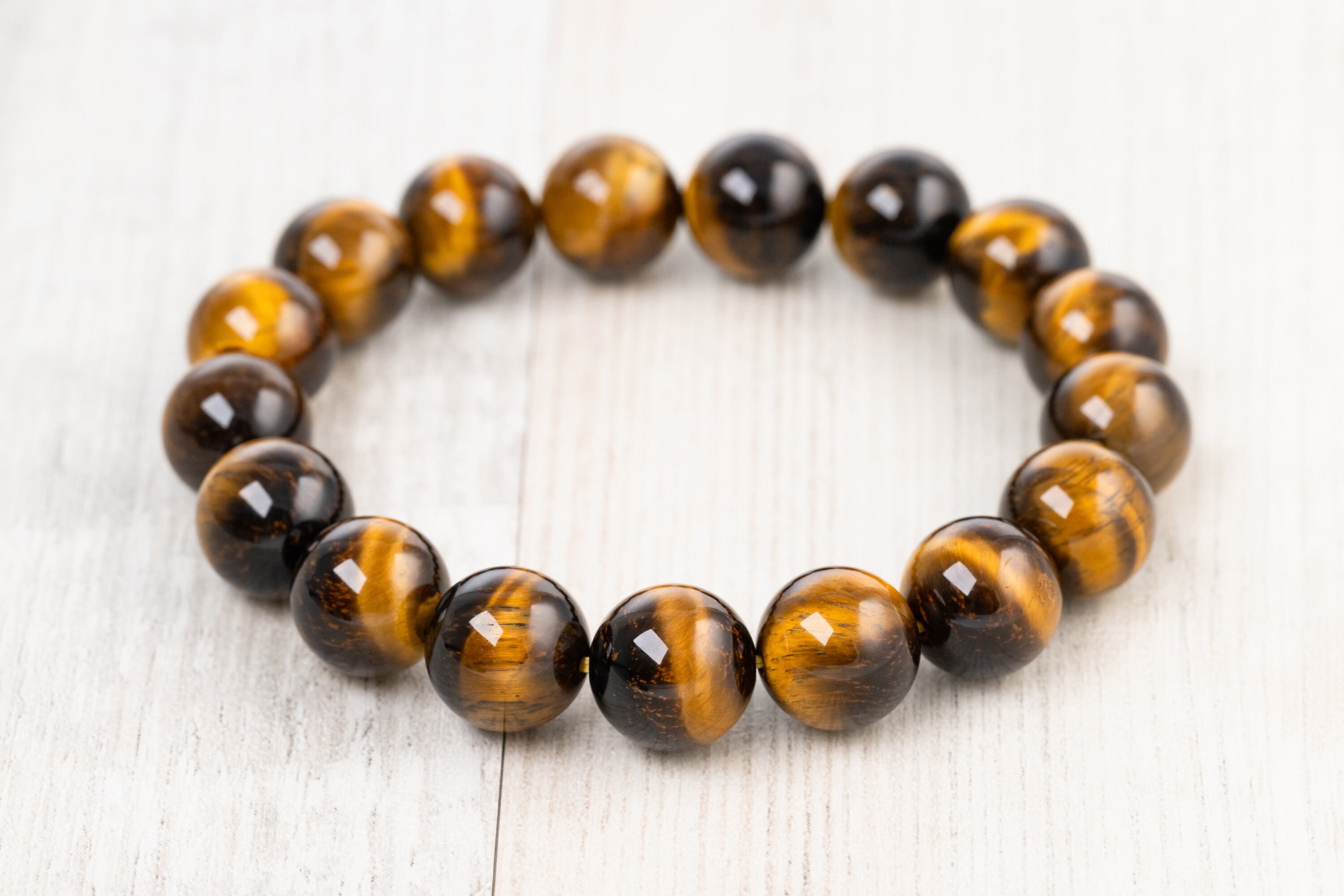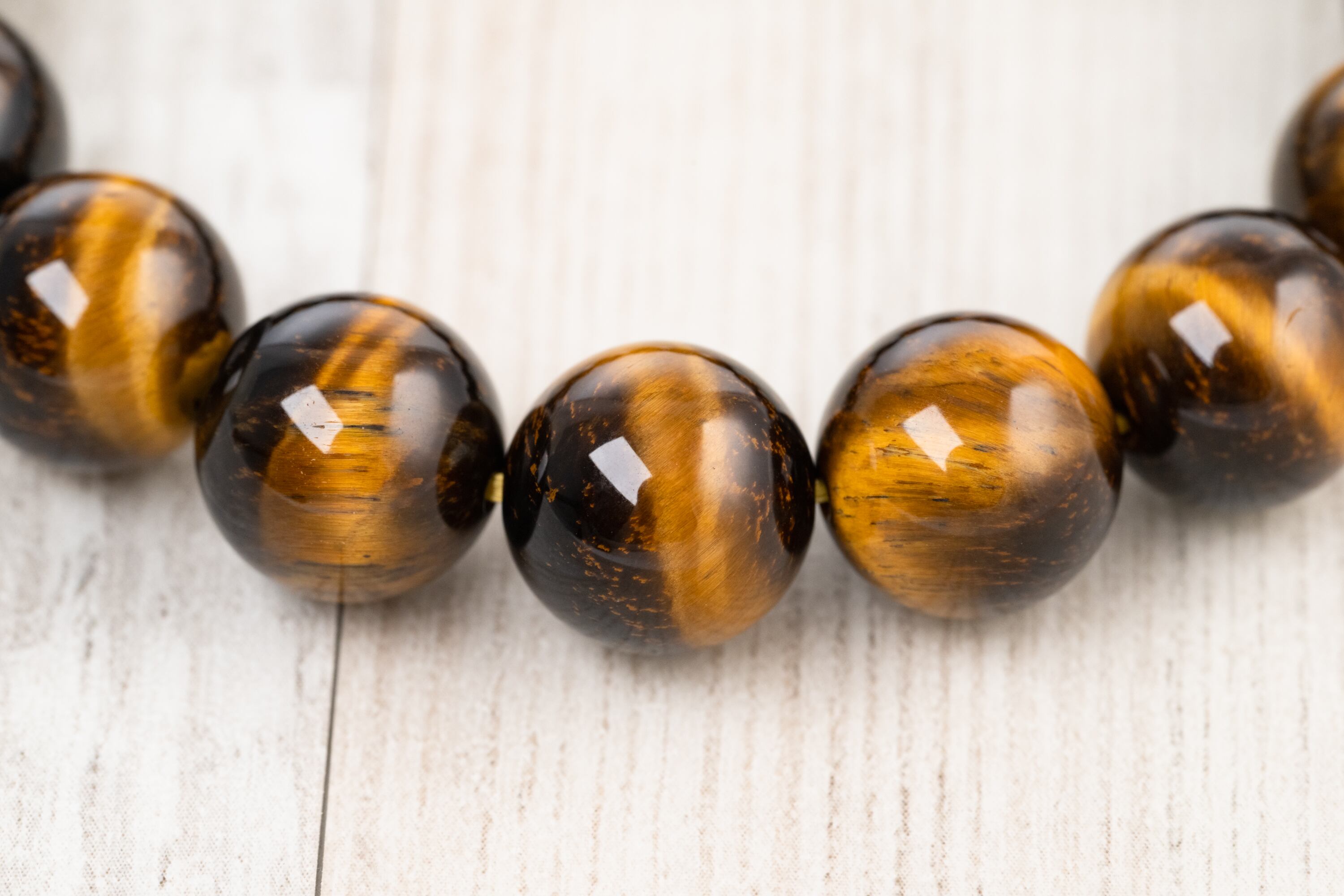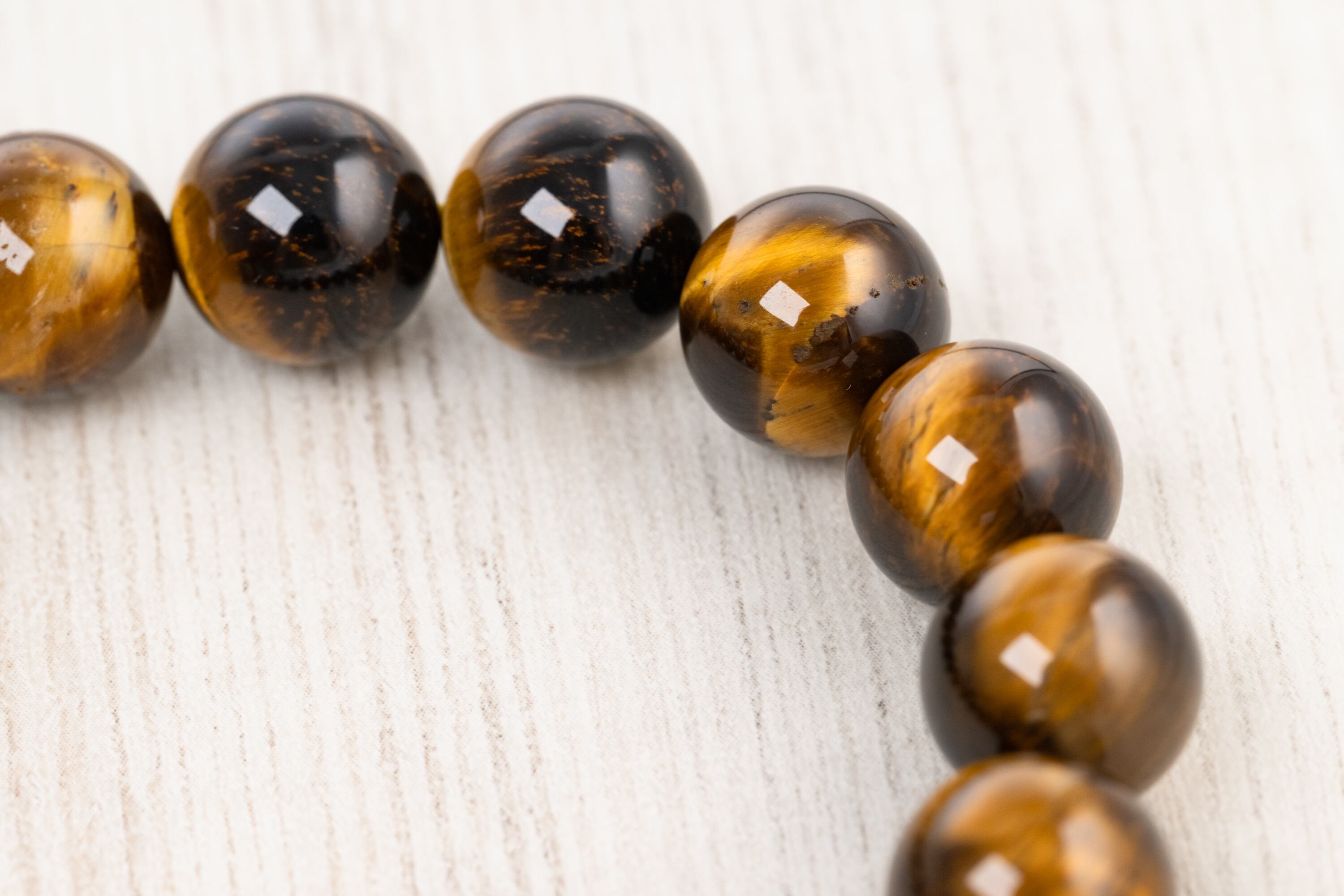 主に南アフリカ等で産出されるタイガーアイは、石英にクロシドライトという鉱物が染み込み、酸化することで特有の黄金色と茶褐色の縞模様が生まれる天然石です。