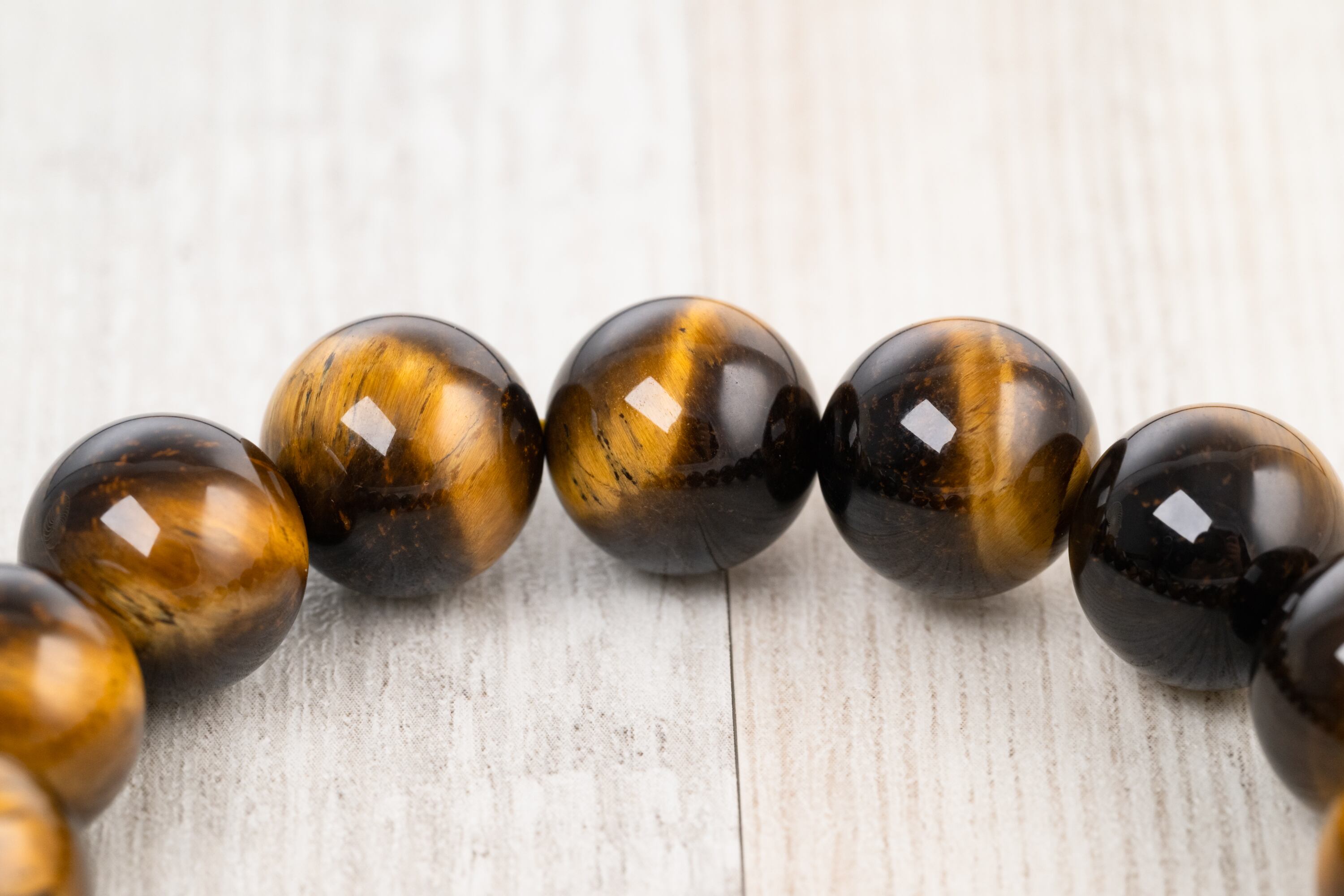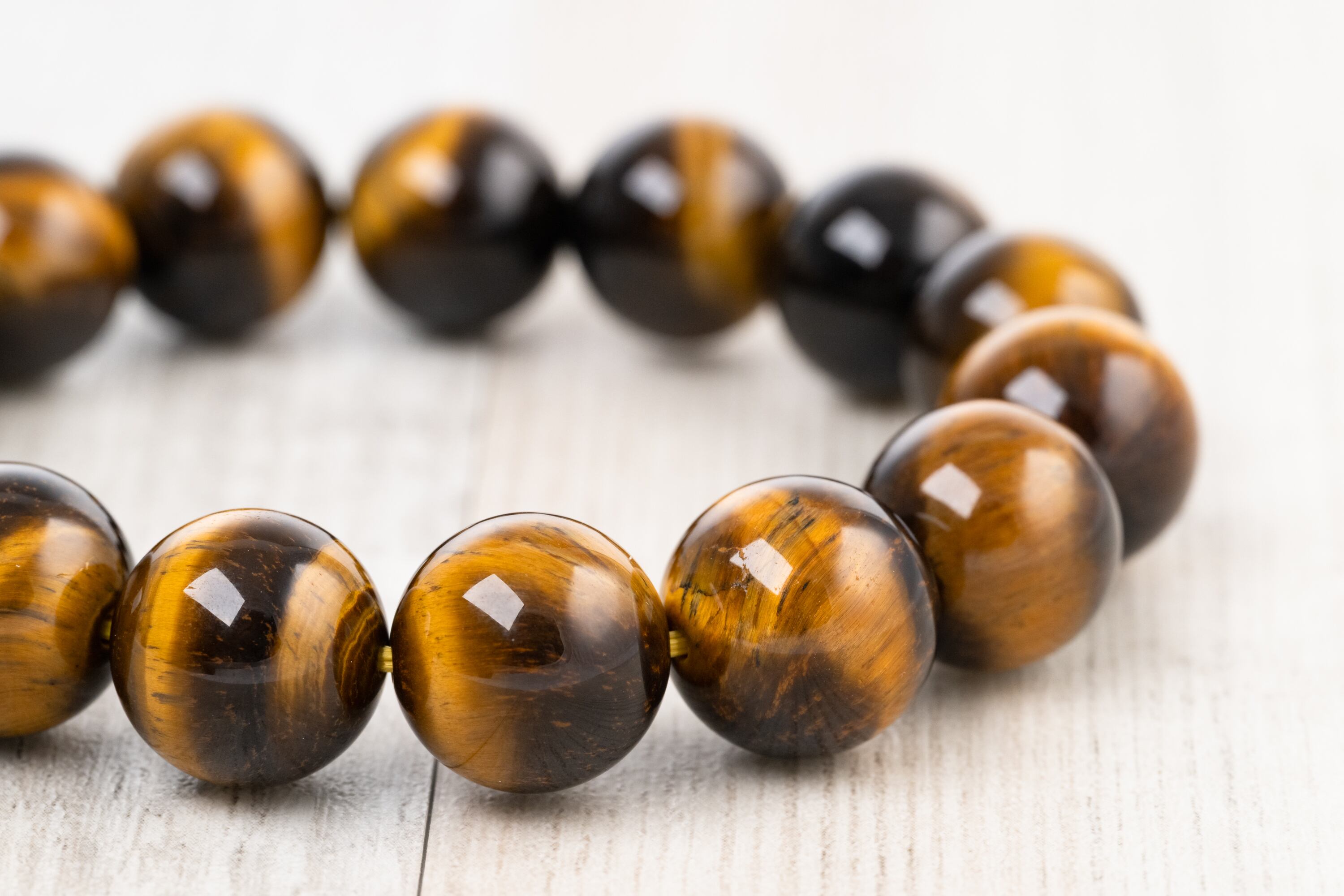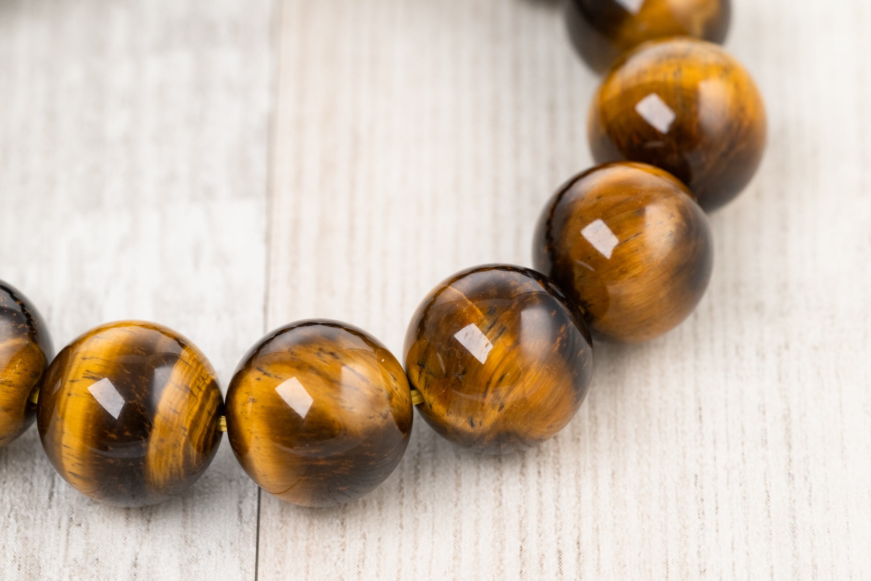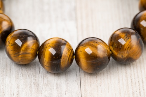 主に南アフリカ等で産出されるタイガーアイは、石英にクロシドライトという鉱物が染み込み、酸化することで特有の黄金色と茶褐色の縞模様が生まれる天然石です。